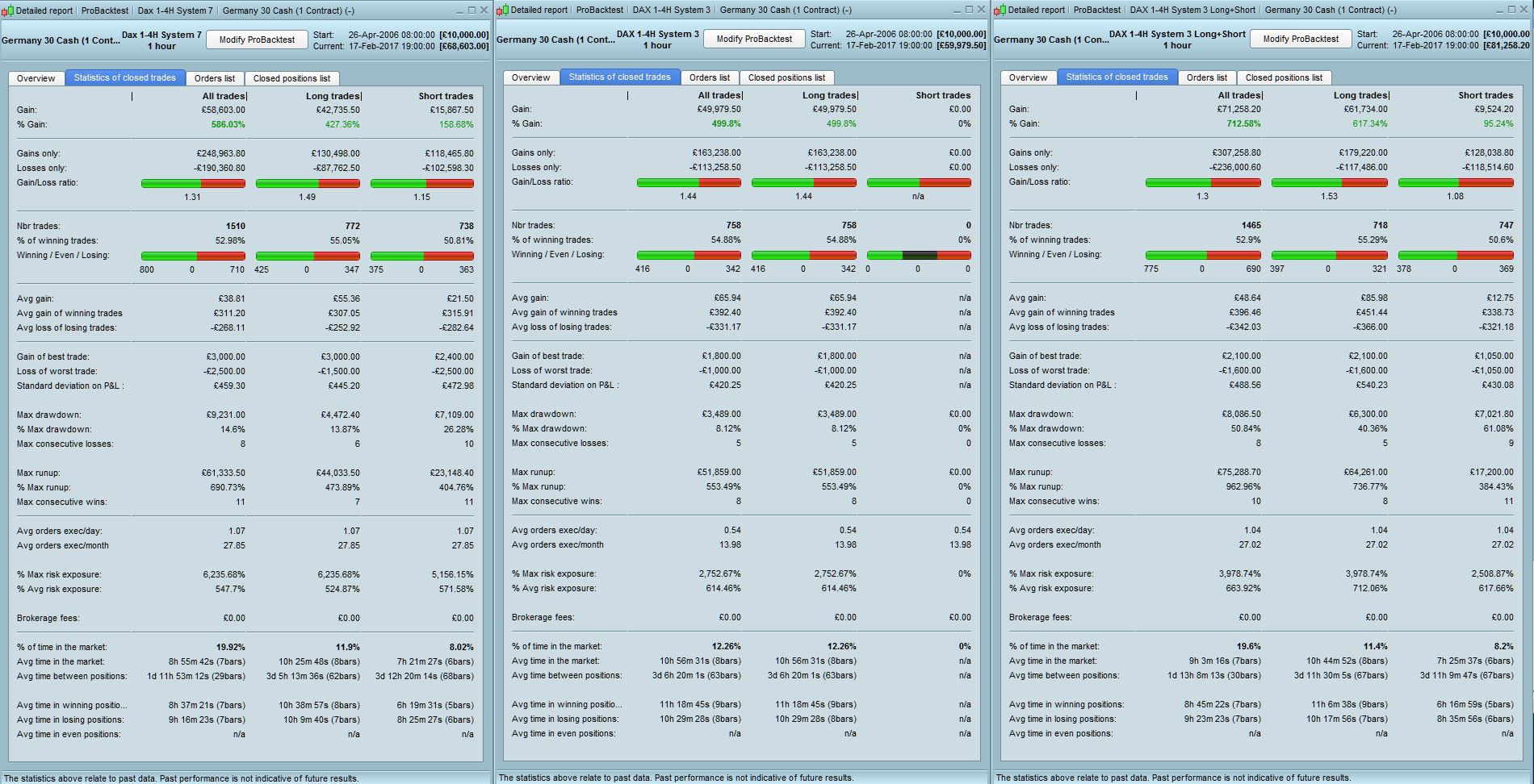 Results as below (system 7) – I have include the system 3 performance for overall comparison and also adjusted a version of System 3 incorporating your code for the short side (System 3 Long + short). Overall the draw of 7 is acceptable at 15% but the profit curve is not ideal as I think it’s too steep to be realistic. Adding the short code to system 3 produces better long terms results but the draw of 50% is too big.