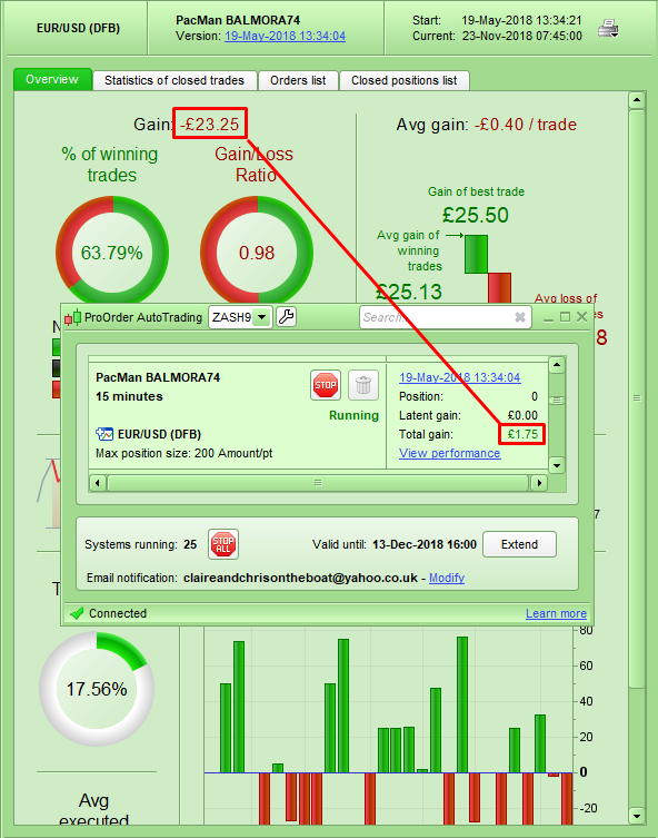 Anyway attached is probably the most recent example … System was started on 21 Oct 18 so 3 weeks ago yesterday and already a £200 discrepancy showing between Total Gain (on List window) = + / PLUS £140.40 while the true figure shows as Gain (on System Stats window) = – / MINUS £342.40 in the Performance Stats window for the System.