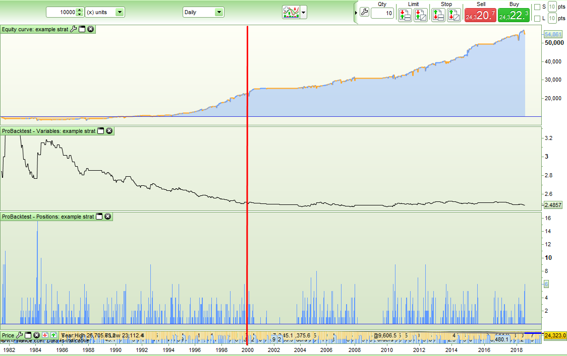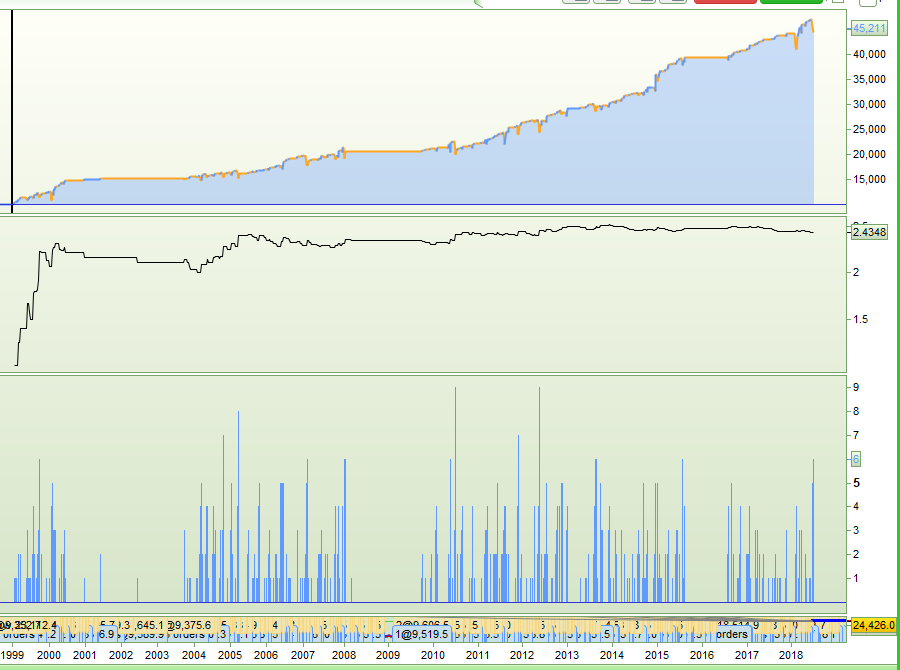 At the beginning of the test period the average is erratic which is to be expected due to a small data sample (but also clearly some bigger trade sizes) but once the average begins to smooth out it starts falling from about 3.2 in 1984 down to 2.5 in 2000. Around the end of the 90’s computerised trading started to take off and it is interesting to see that since then this sort of strategies average position size has stayed fairly stable at around 2.5 positions opened for each average down. It would seem that testing on data prior to 2000 is not going to tell us much about how markets are behaving today for this sort of strategy.