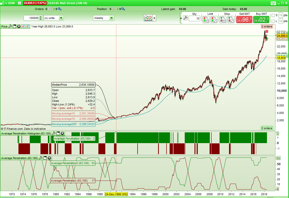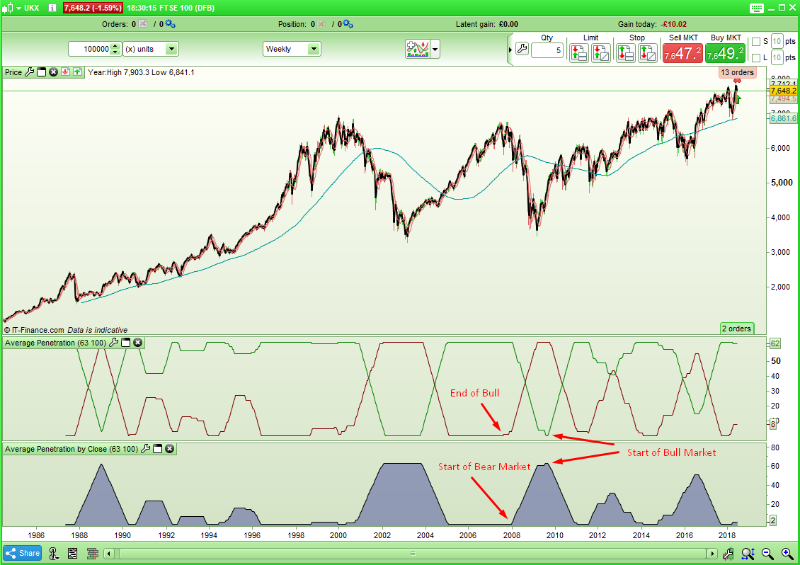1234567LBPeriod = 63AvePeriod = 100LowPen = summation[LBPeriod](low < Average[AvePeriod])HighPen = summation[LBPeriod](high > Average[AvePeriod])return LowPen coloured(128,0,0), HighPen coloured(0,128,0)It is meant to be applied to daily charts but I found that as an overall trend filter on weekly charts it worked pretty well so that is what I have shown here.