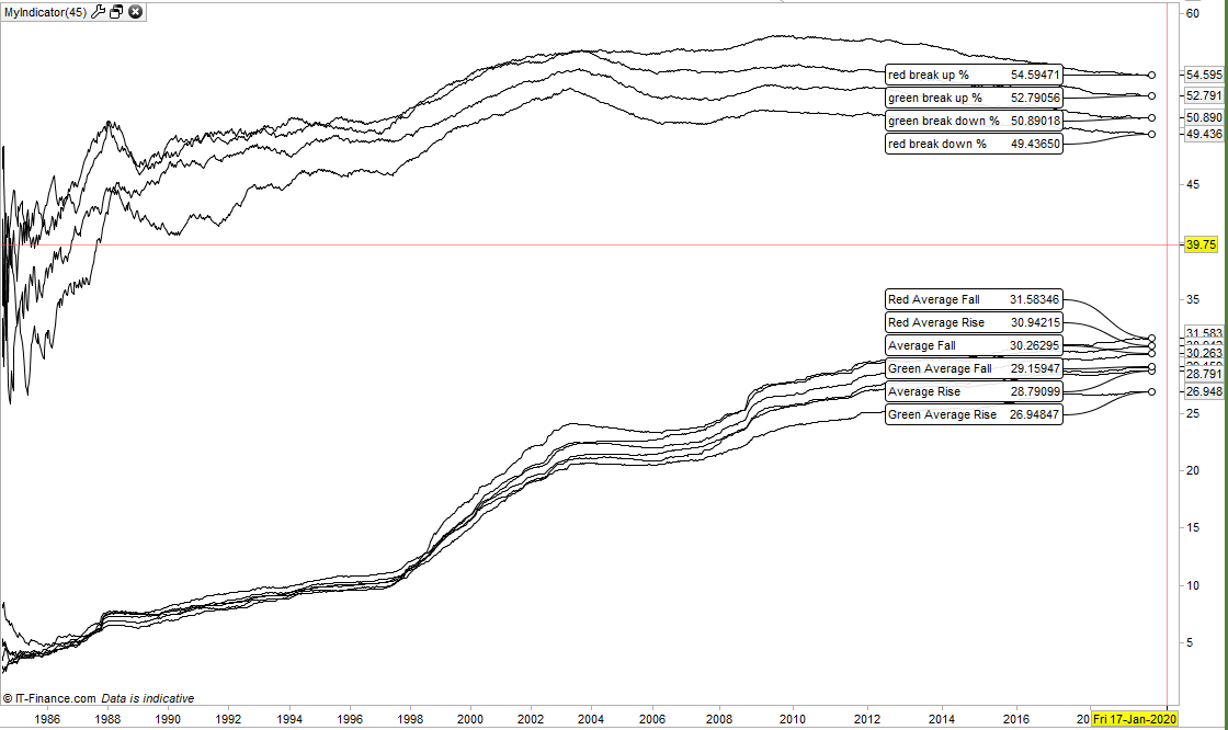 I wrote an indicator to analyse the average rise and fall from an opening price of every candle and to see how often that average rise and fall is broken by the high or low of a candle.