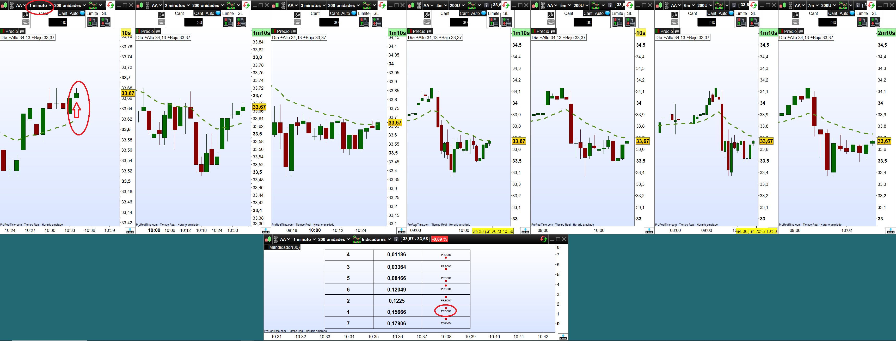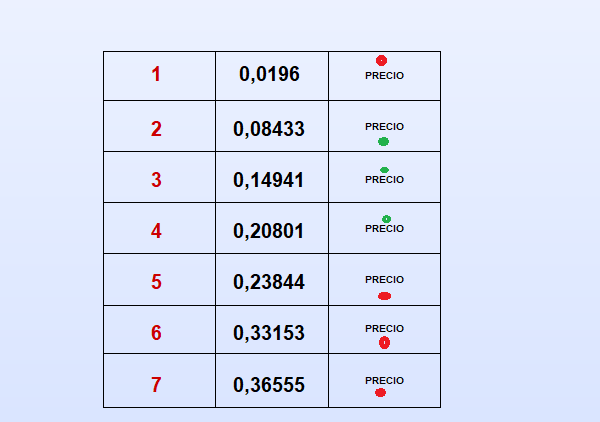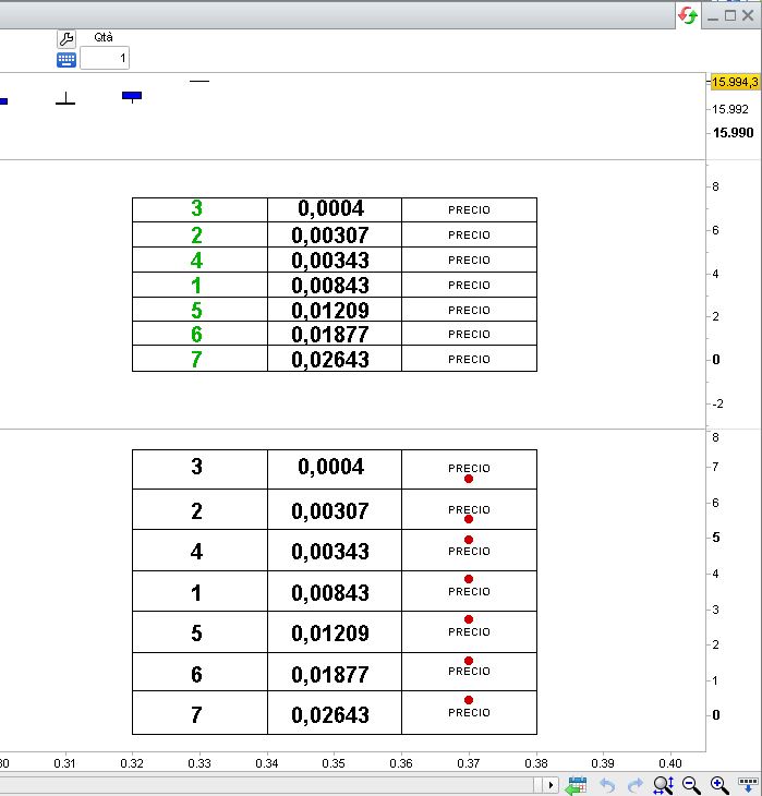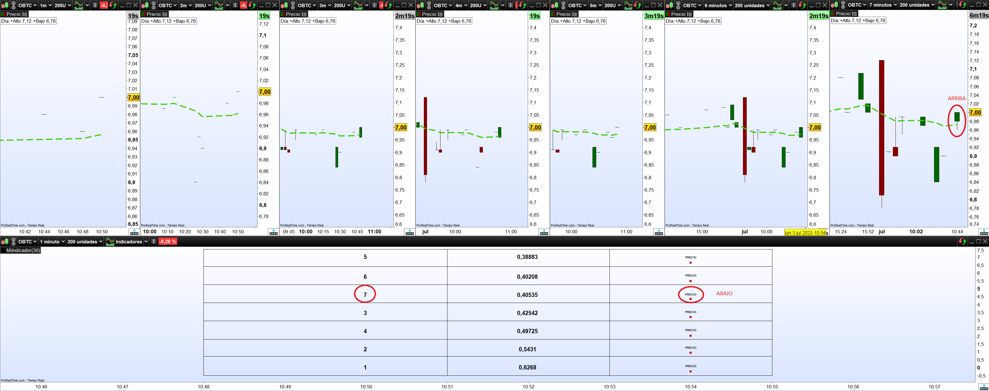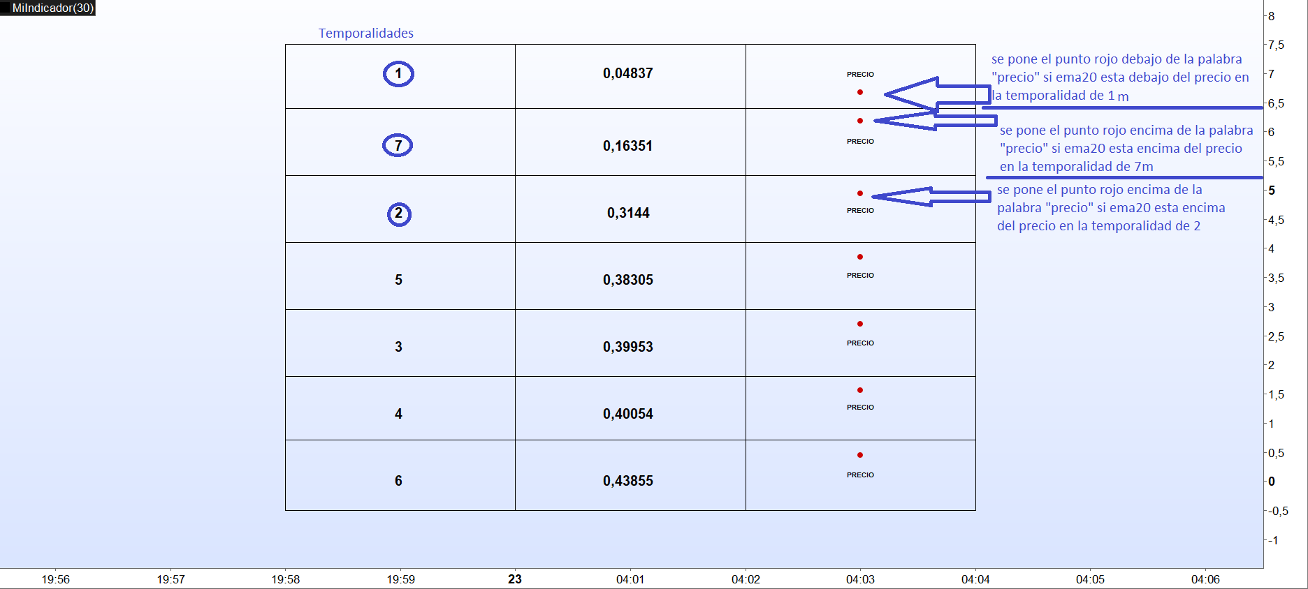 Buenos dias te adjunto la foto para que me entiendas dependiendo de cada temporalidad y donde este situado ema20 se colorea un punto encima o debajo de la palabra “precio” en la temporalidad que le corresponda, en la imagen esta 1mn la primera y ema20 por debajo del precio en el grafico de 1mn pues un punto rojo debajo de la palabra “precio”, la segunda temporalidad sale 7m y esta el precio por encima de ema20 pues el punto debajo de la palabra “precio” y asi correlativamente y que vayan con las temporalidades. Un saludo espero que lo entiendas ahora