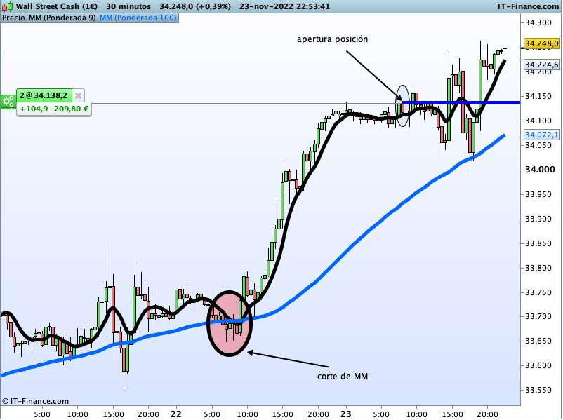 La idea es sencilla; cuando se produce cruce al alza de MM9 versus MM100, se da una primera señal de entrada con largos y cuando el cruze es a la baja se da primera señal para abrir cortos.. Pero hasta que la distancia entre las MM no sea mínimo de 60 puntos no debe realizarse la apertura de largos o cortos, según el caso.