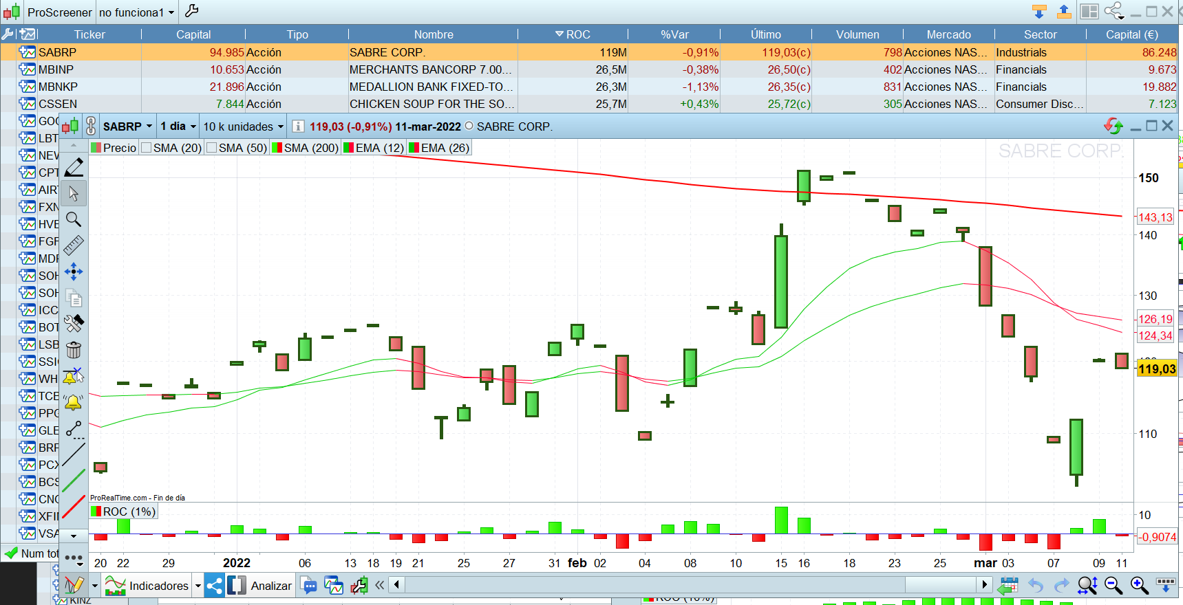 He programado un sencillo screener que busque los valores que han subido más que un 20 % en el día. Lo he hecho con la programación simplificada a través del gráfico con el indicador insertado. Cómo se puede ver en la imagen adjunta el indicador señala perfectamente el porcentaje de variación en el precio. En cambio los resultados del proscreener no tienen nada que ver con lo que yo busco que es una variación diaria superior al 20% ya que como se puede observar hay variaciones incluso negativas. Los teóricos resultados del screener se muestran en la columna cuarta (ROC) ordenados teóricamente de mayor a menor sin embargo parece que esos resultados nada tienen que ver con los datos del indicador seleccionado. Por otra parte como se puede observar en la imagen en la columna quinta (%var) figura la variación diaria qué redondeada es igual al resultado del indicador que yo he colocado en el screener y en el gráfico. Se puede ver que el resultado de la variación diaria para el valor SABRP coincide perfectamente con el indicador ROC del gráfico en cambio no coincide con el resultado que muestra el proscreener que es totalmente distinto. Yo creo que es un error del programa porque no le encuentro explicación de todos modos es posible que yo haya hecho algo mal. También he hecho la prueba con la programación manual y sale el mismo error. Los cálculos se han realizado con el cierre del nasdaq del día 11 de marzo de 2022.