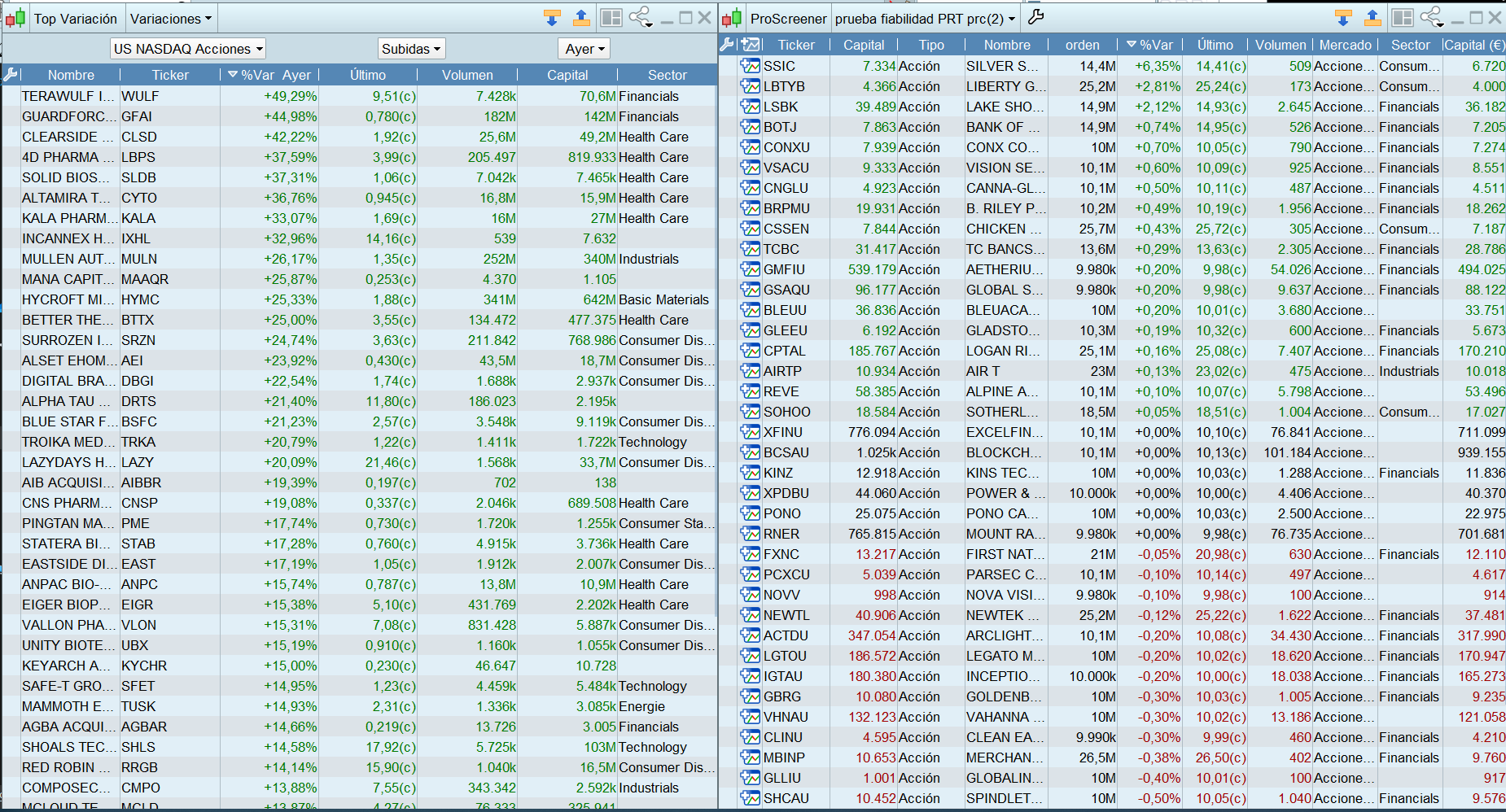 La primera ha sido pinchar dentro de prorealtime en el menú mostrar- top variaciones 1 – US nasdaq acciones y comparar los resultados con el screener, cuyo código adjunto, aplicado sobre la misma lista