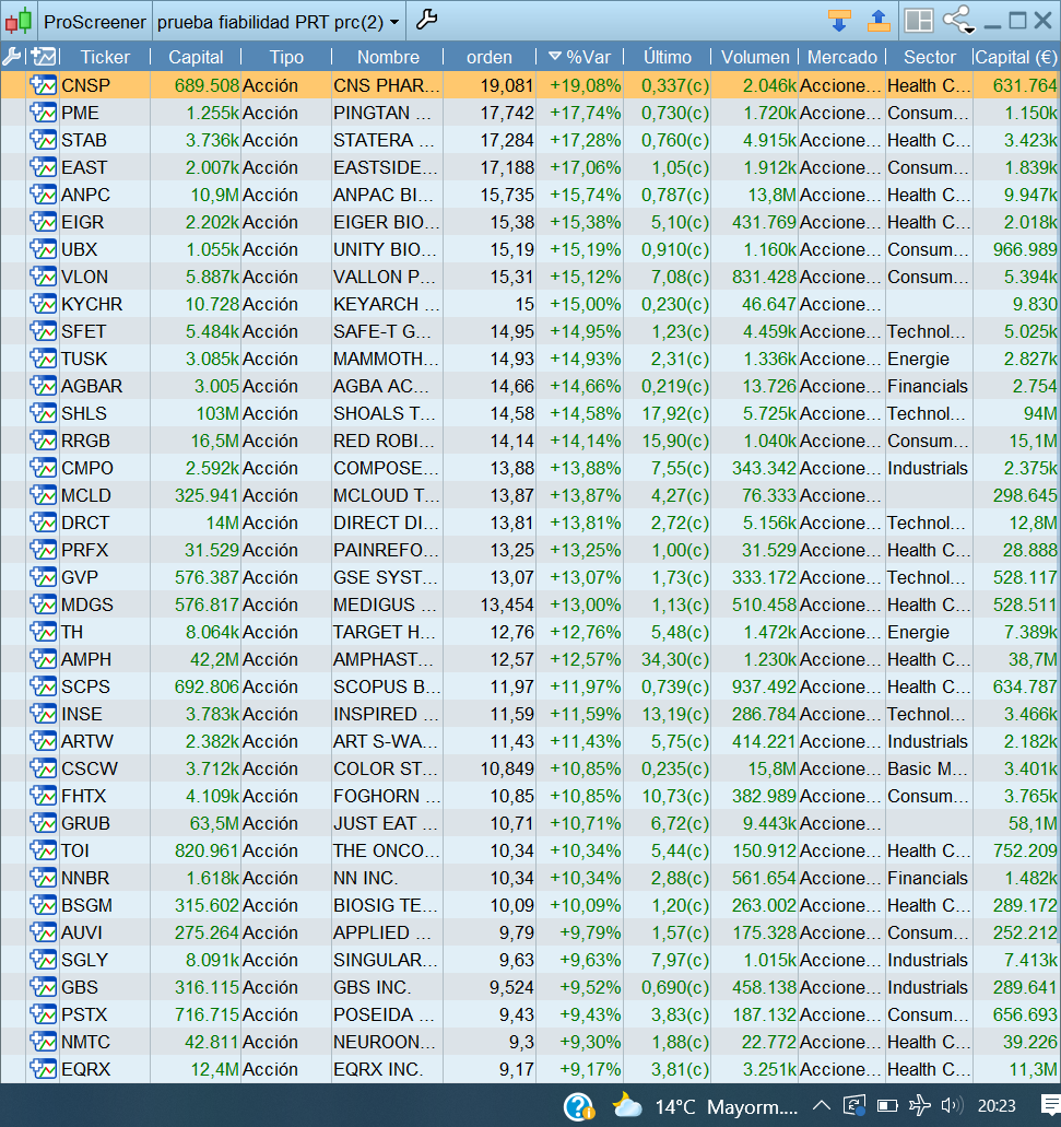 y es curioso en este caso me saca solo los resultados con subidas inferiores al 20% y al contrario que en el caso anterior parece que los resultados son fiables y correctos.