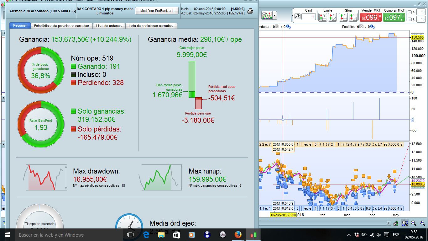 Por mera casualidad y haciendo una prueva me dio un muy buen resultado un code en el que el takeprofit y el stoploss son unos valores muy pequeños respecto a las unidades del indice- DAX. Querria preguntar si esta simulacion en timeframe de 5 minutos es correcta o es simplemente un fallo de programa. El indice es el DAX mini 5 y el spread es 1,5 pip. gracias por adelantado.