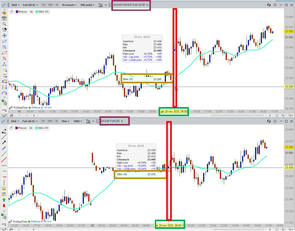 In ogni caso se usi, ad esempio, una media mobile semplice a 20 periodi, dalle ore 08.00 sono diversi i dati delle prima 20 barre, perché uno le ha, l’altro no e deve prendere quelle della sera prima. Però dopo 20 barre i calcoli diventano identici, perché entrambi quotano lo stesso prezzo ed hanno lo stesso numero di barre a disposizione.