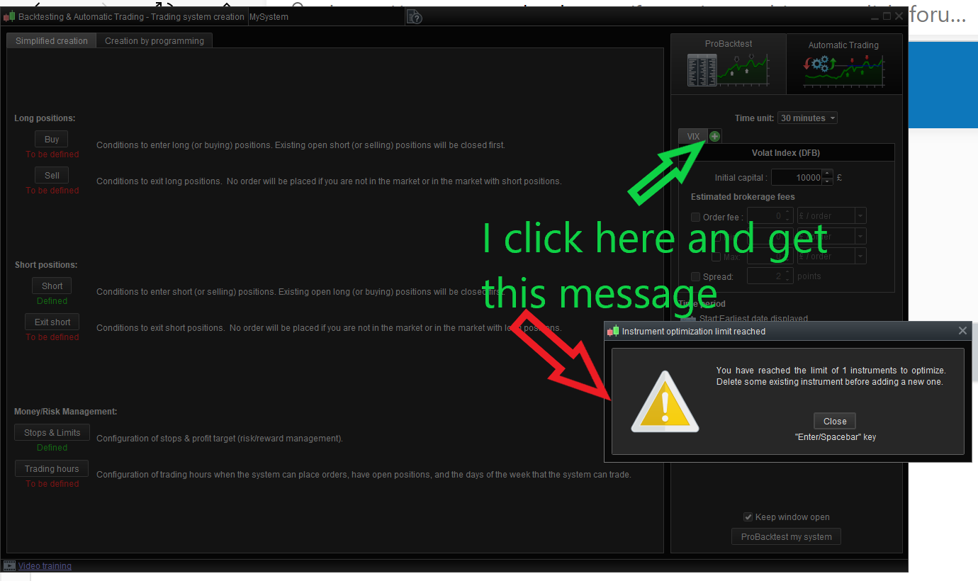 Does anyone know how to do this? When I try to add another instrument (By clicking green + sign) I get the error message displayed.