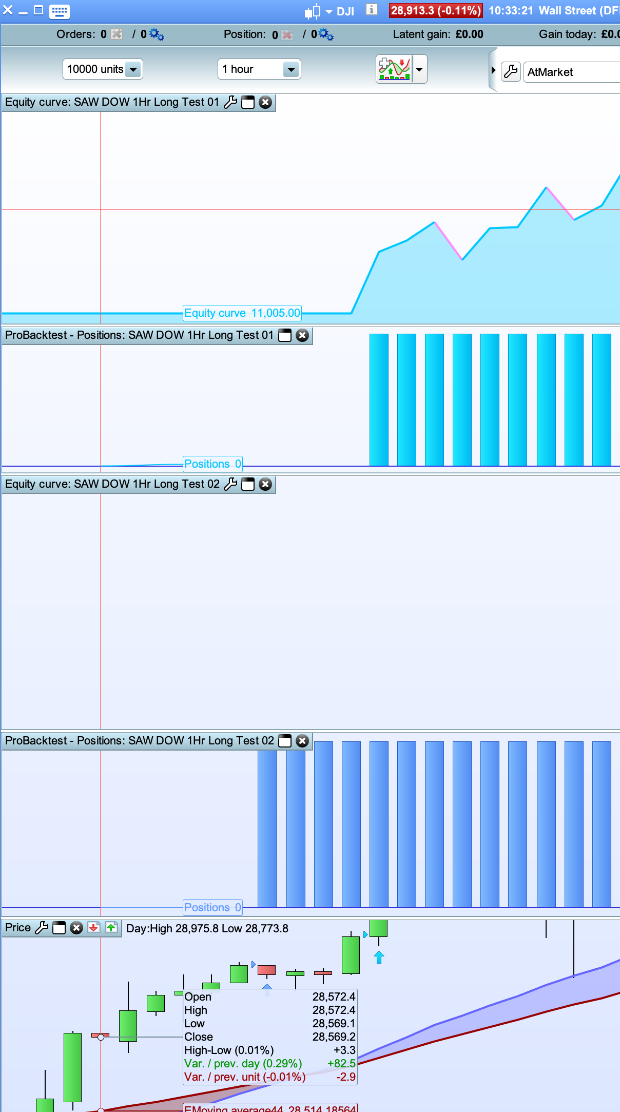 I’ve loaded up the two test codes:c(my striped down original code). & SAW DOW 1Hr Long Test 02 (My comparison code built in the wizard).