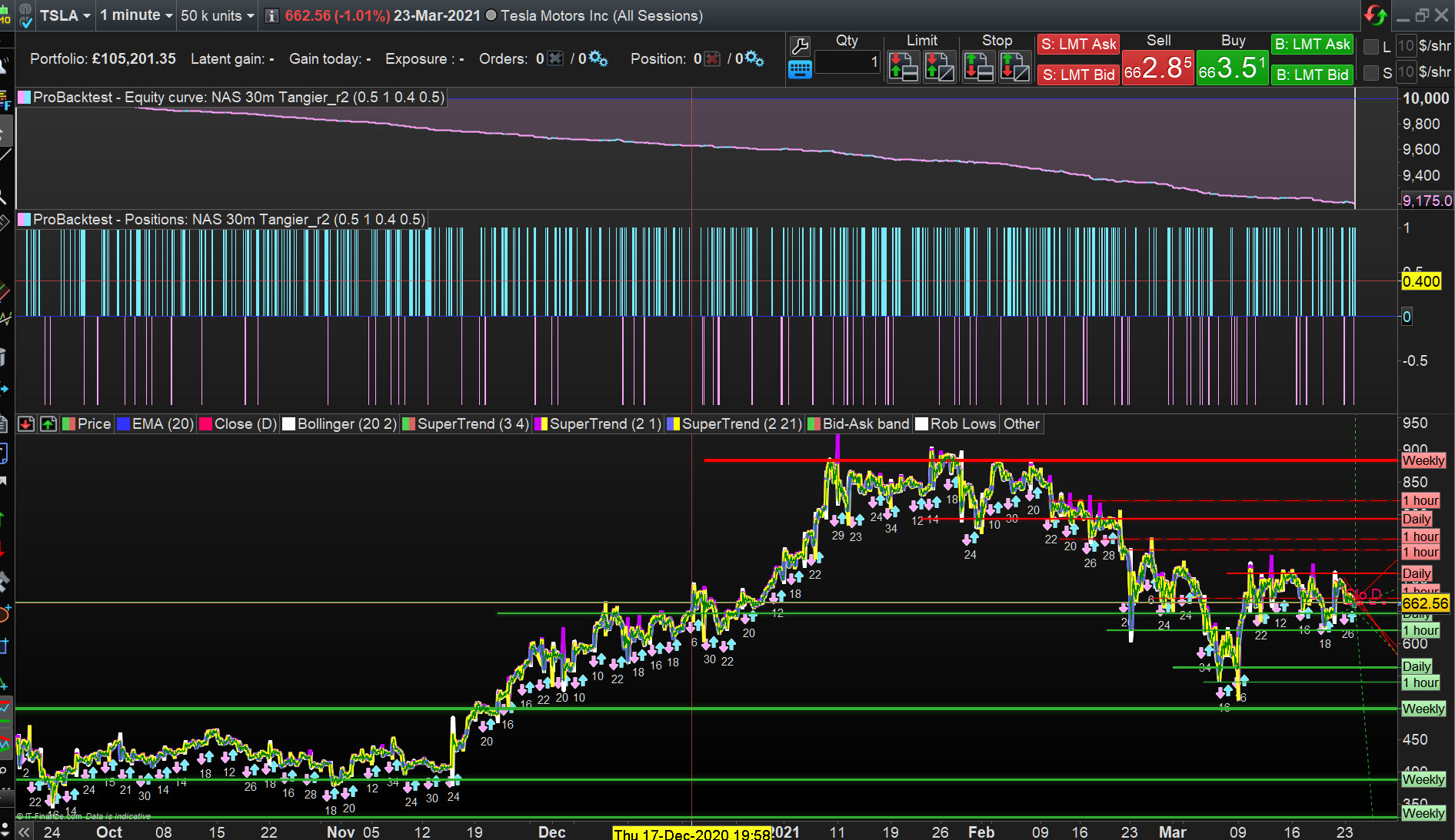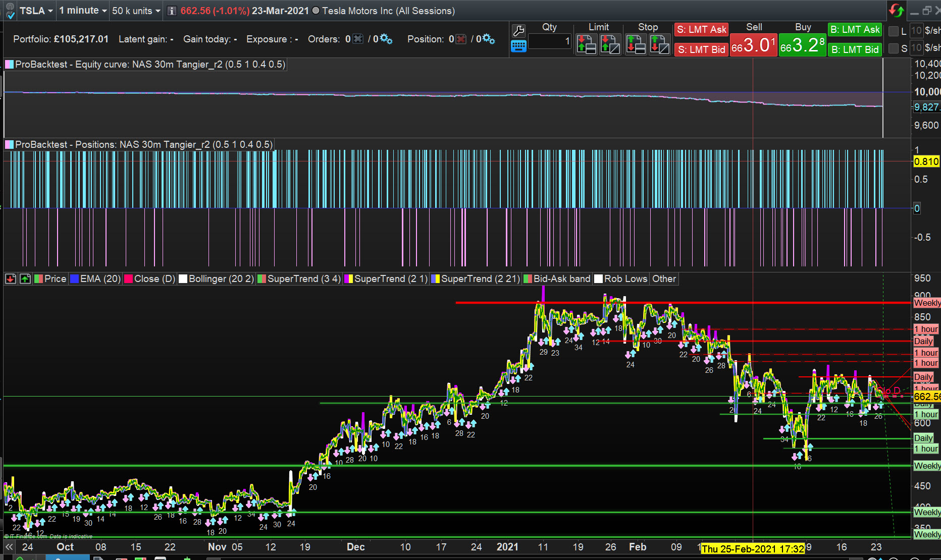 Interesting result. Thanks for that. Correct me if I’m wrong but (9827 – 9175)/ 669 trades means an implied spread limit in the system of 0.974. I used a spread of 100 just to see whether there would be a difference in the resulting gain. However, as you’ll know, Tesla has a very volatile spread which seems to vary between 40 and even over 100 depending on when one trades so in a back testing strategy I like to use more of an average spread rather than what the spread is at the time. For Wall Street I specify a spread of 3.2 which is excessive but introduces a margin of safety, and find that the back testing and actual results in my IG demo/live accounts against live data are pretty much in line as a result.