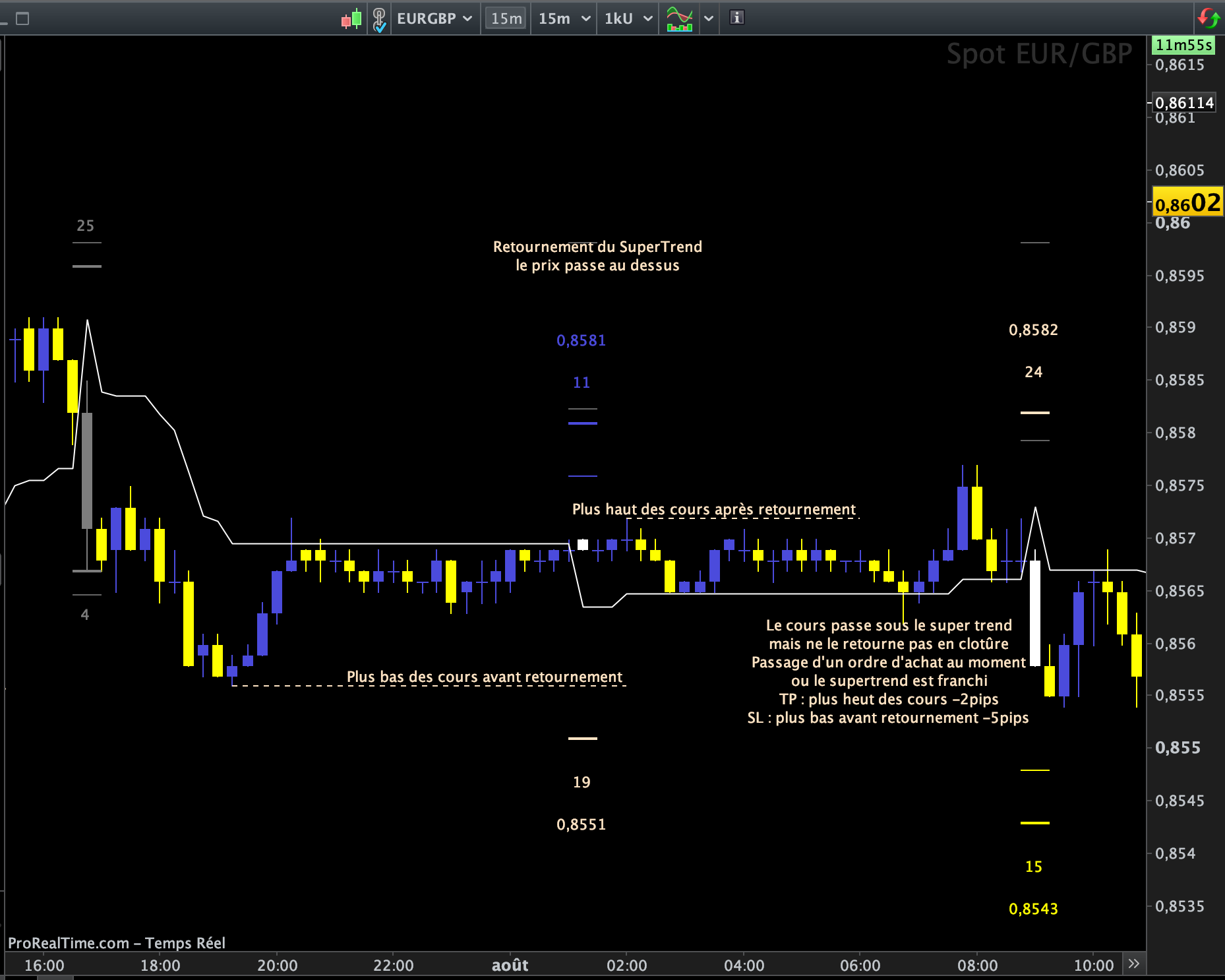 Pour sortir de me positions, soit le TP est atteint, soit je sors au marché sur retournement du Supertrend à la baisse.