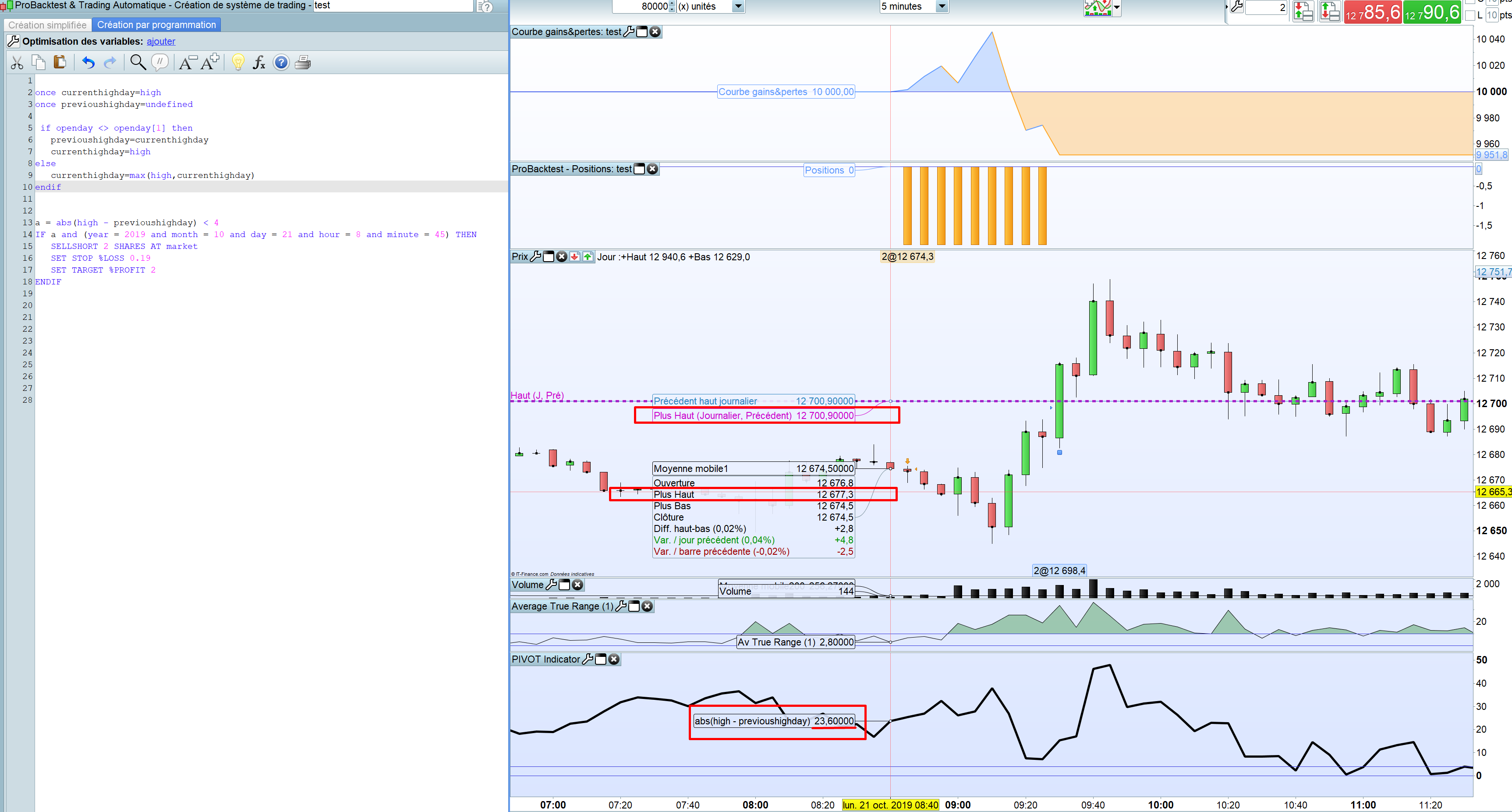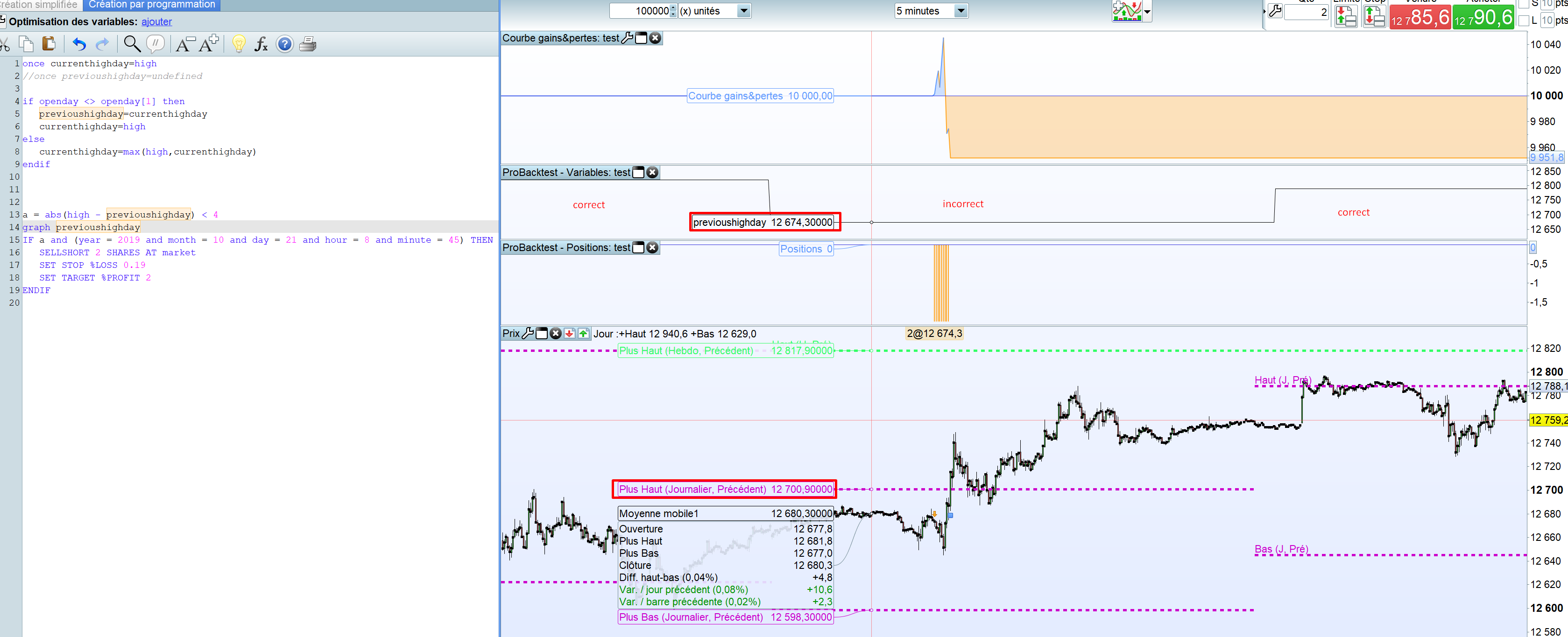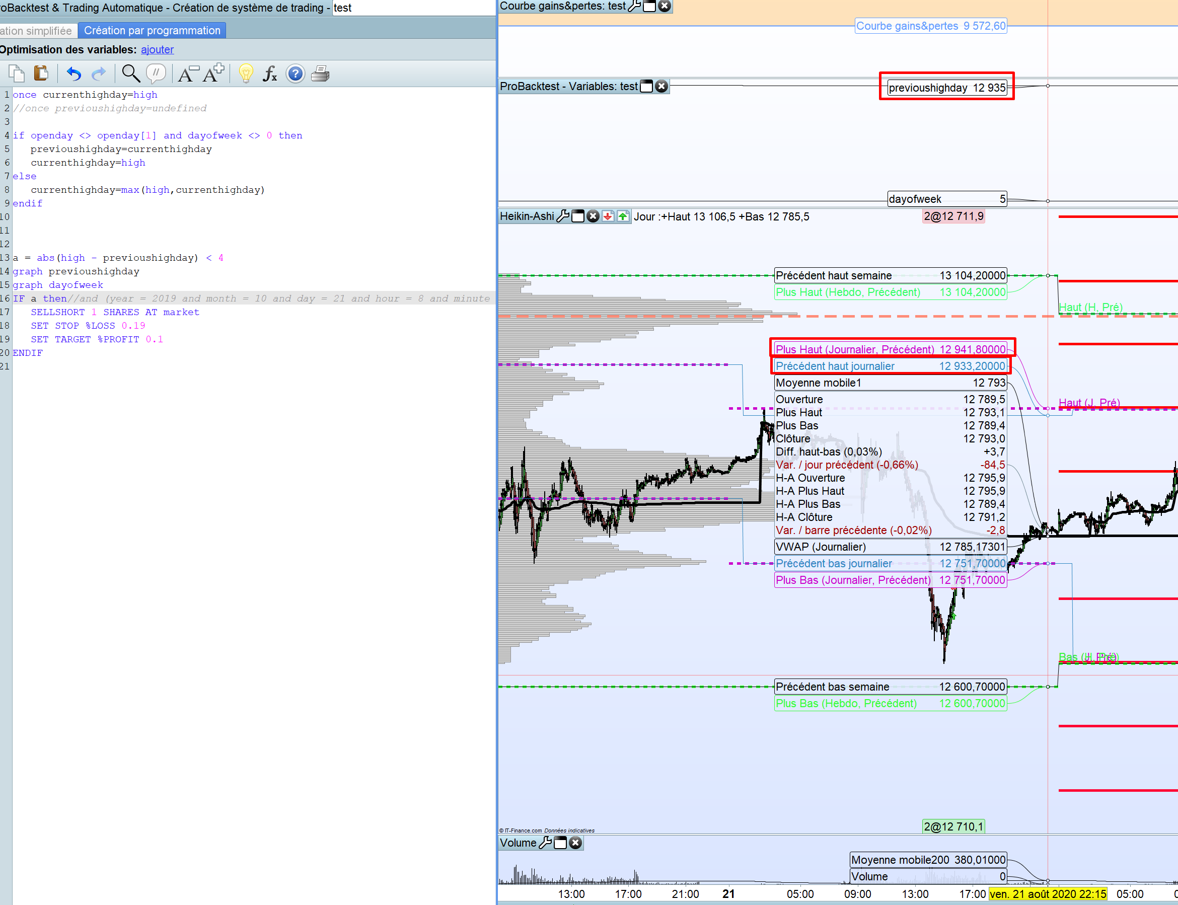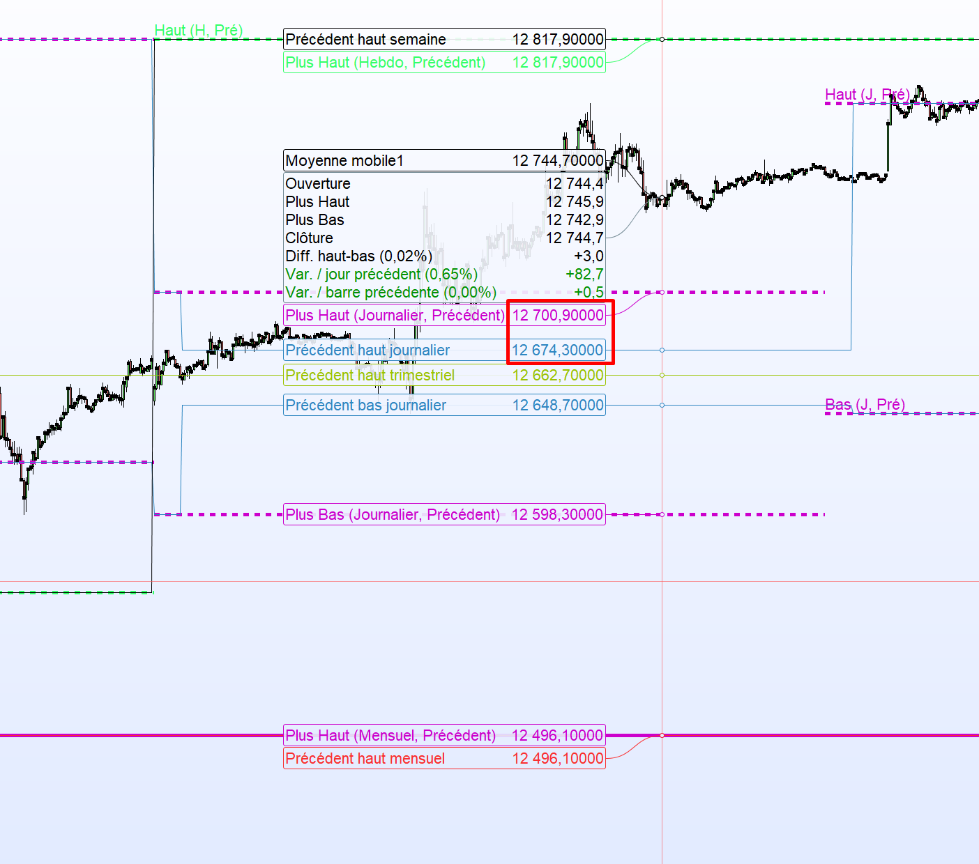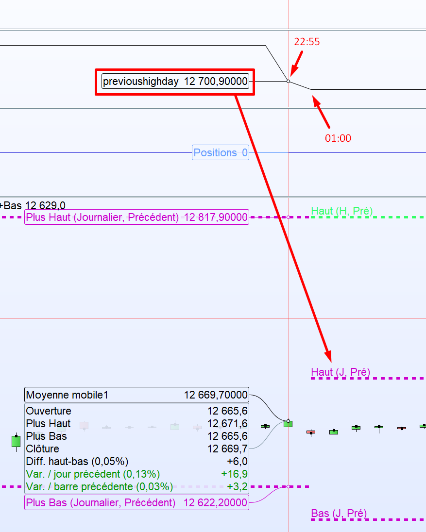 Ce que j’ai remarquer aussi c’est que quelque soit le jour de la semaine l’indicateur (c’est à dire previoushighday) change sa valeur à 1H du matin alors que l’indicateur ligne de prix de PRT pour avoir le plus journalier de la veille se réinitialise à 00:00.