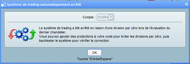 Bonjour, J’ai testé le code ci-dessous trouvé sur ce site et alors que le backtest fonctionne correctement, en réel le trading s’arrête en affichant le message d’erreur (copie d’écran ci-dessous) “division par zéro lors de l’évaluation du dernier chandelier”. Pourriez-vous m’aider à trouver d’où vient l’erreur dans le code?