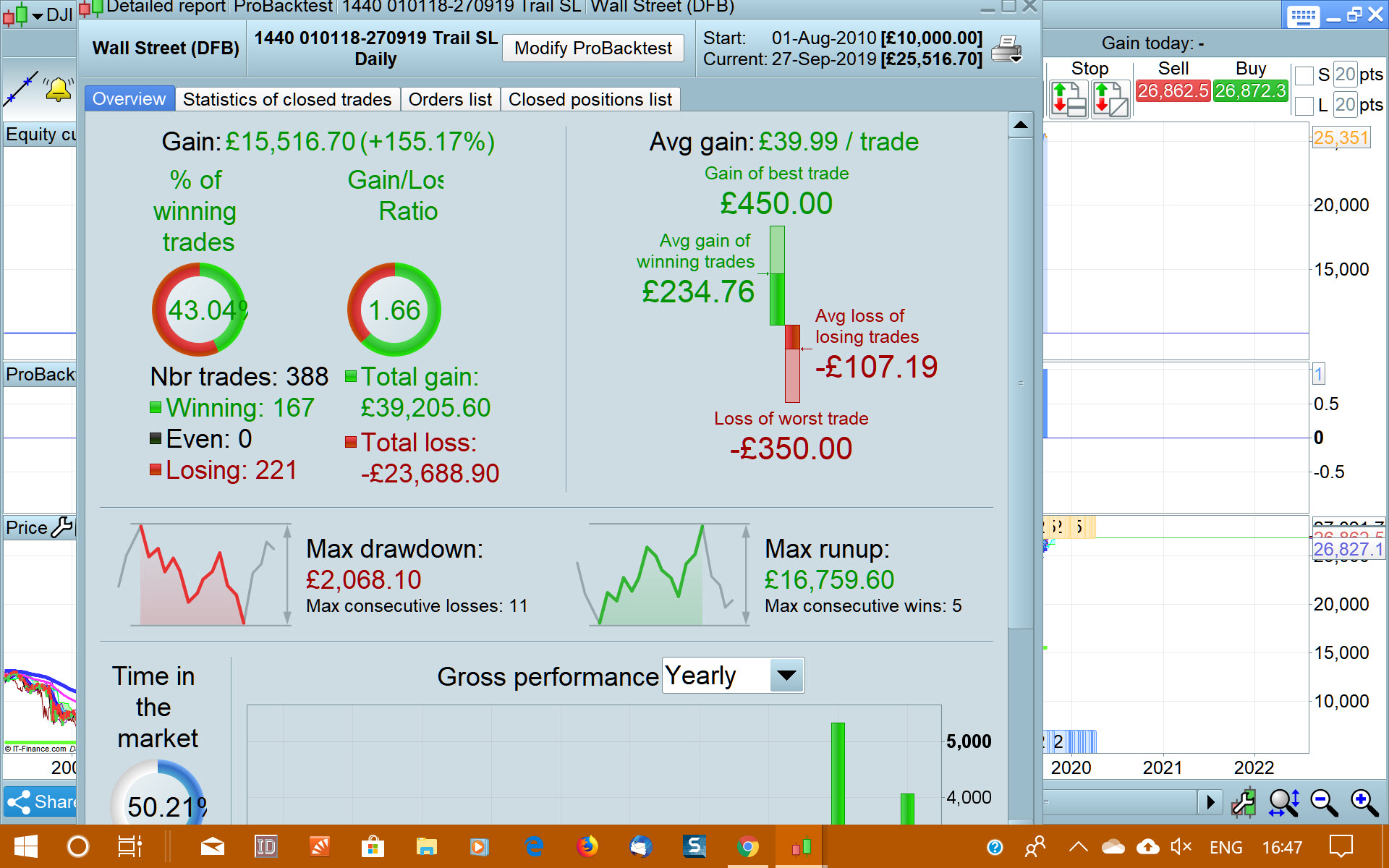 At the end of the day we must always compare our equity curve to buy and hold on something like the DJI. We either want to seriously beat it or get very close to it but avoid all the major draw downs on the way or we want a strategy that just consistently and repeatedly makes money and more money than we could get if we invested in something much lower risk than spread betting.