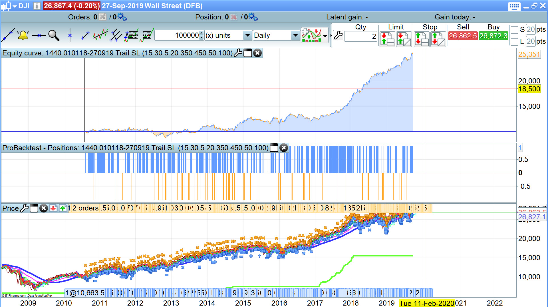 There is also the concern that during the test period the DJI has basically been a bull market except since the beginning of 2018 where it has been going sideways in a very volatile manner. The majority of robustness tests show the equity curve as being under water for 50% to 75% of the first part of the test period before taking off in a very bullish market and then going sideways again in a very volatile sideways market. This concerns me. Would I want to trade something that goes sideways or is in a small loss for 7 to 8 years of a 9 year test period – probably not.