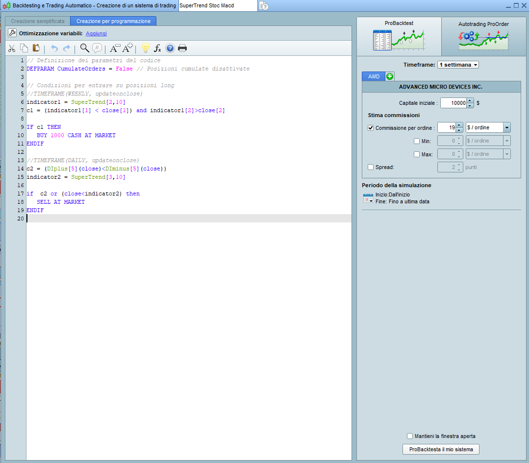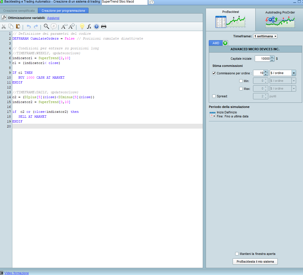 Eppure il grafico mostra il supertrend 2-10 sul settimanale ed il codice è impostato come long dopo la prima candela chiusa sopra all’indicatore,