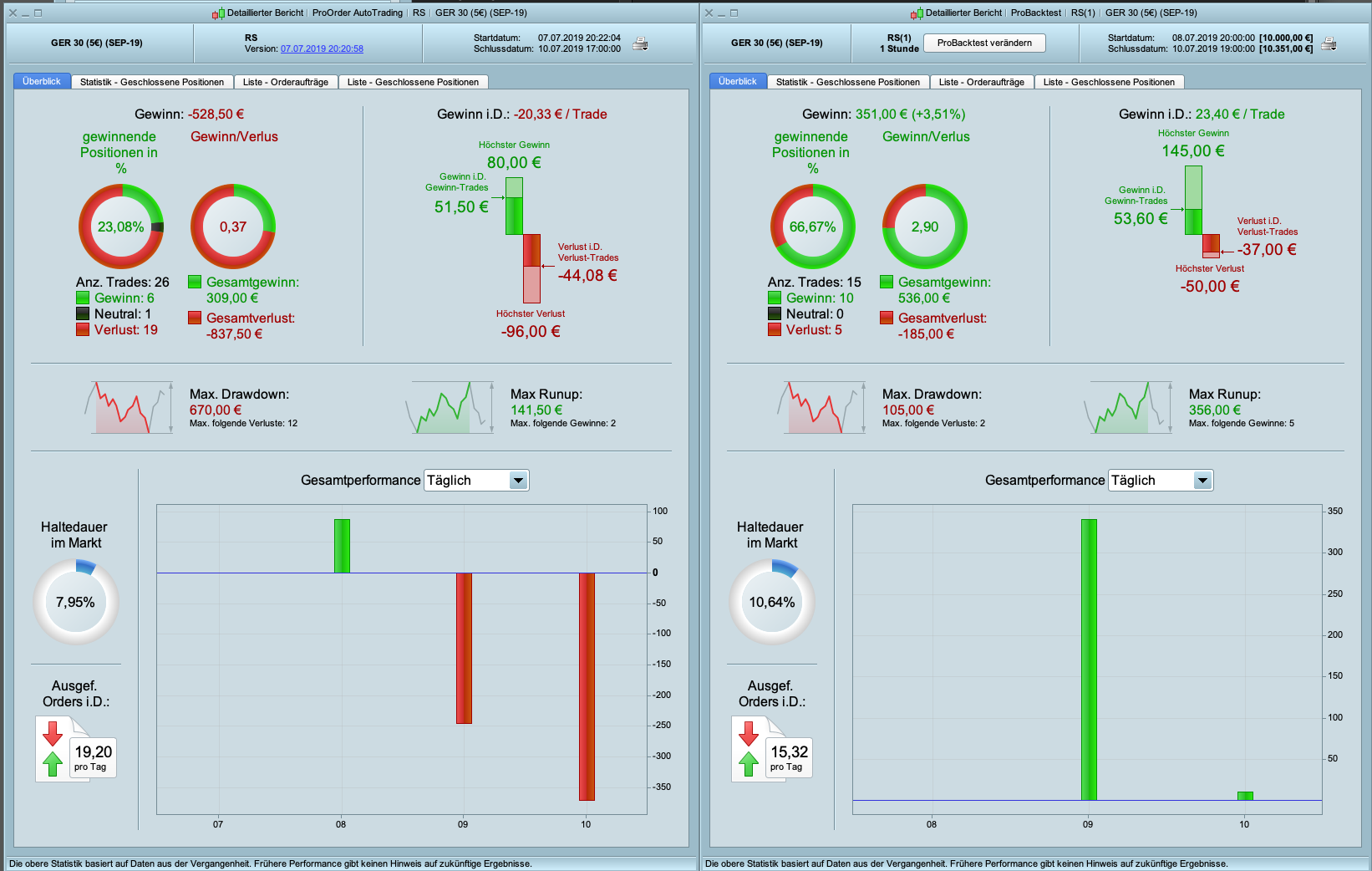 anbei ein Bild (und Code) auf dem links der tazächliche Handel der letzten 3 Tage zu sehen ist und rechts der Backtest der gleichen Tage.