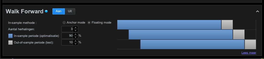 Per iniziare in modo semplice con il Walk-Forward, imposta il periodo IS al 70% (così l’OOS = 30%) e usa la “Anchor mode”. Eseguendo l’ottimizzazione, il 70% della storia viene usato per ottimizzare (IS) e i parametri ottimizzati vengono applicati al periodo OOS (30%). Se nel report dettagliato delle statistiche di Walk-Forward vedi una WFE del 100%, è la situazione ideale: il sistema rende allo stesso modo in OOS e in IS. In seguito puoi sperimentare con altre durate, ripetizioni e modalità di ancoraggio.