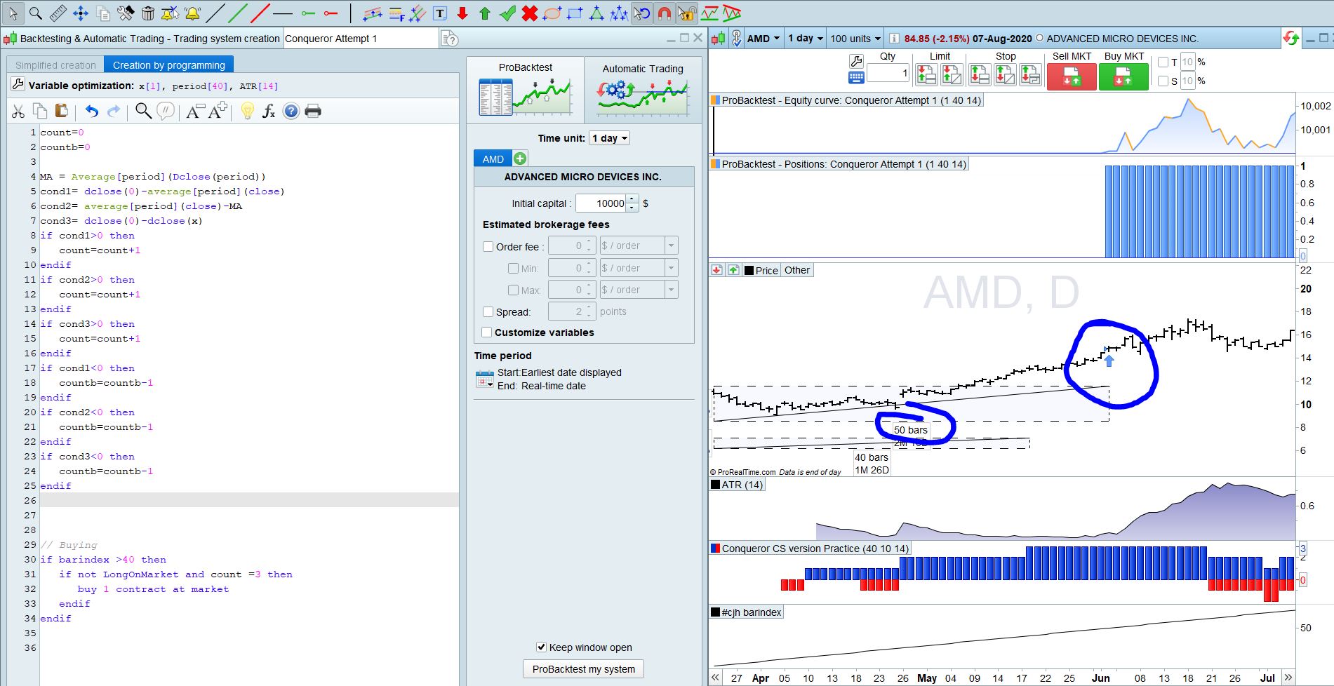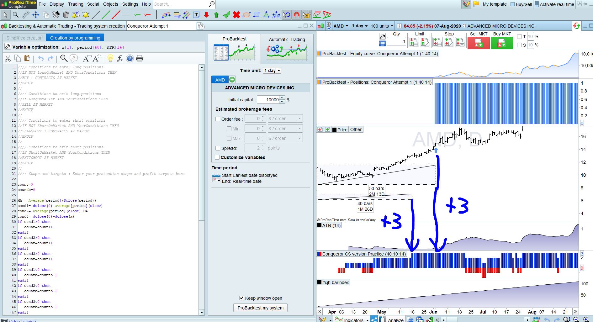 I use daily (time frame) and regardless of the units (i use 200 units). Starting the backtest i need to skip the first 40 days of the data as all three of the conditions have not had time to be tested yet. I would assume i can use the “bar index” to determine when i can finally activate buy or selling but the system just doesn’t seem to work as I thought. If you use AMD you can see in my screen shot that the first buy signal is at 50 days it it should be may 18th on the 40th day. So my question is how do I use bar index or some other code to ensure that the buying and selling happens after the first 40 days?