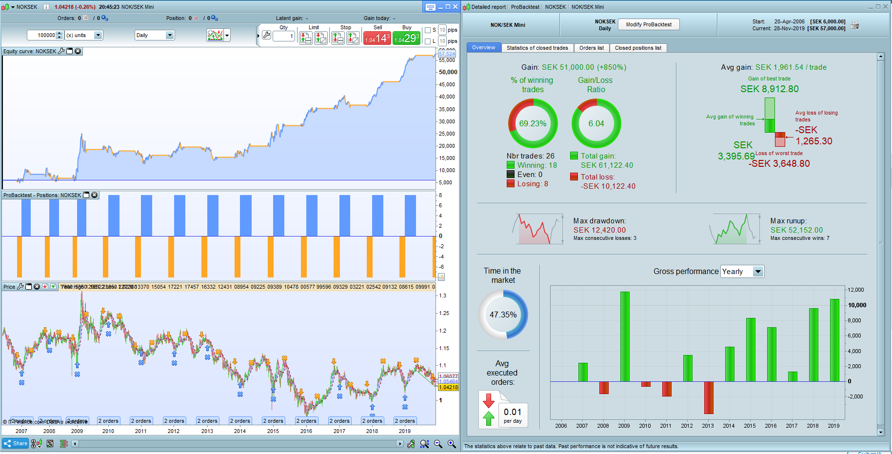 A better initial capital would be 3 to 4 times the DD, that is roughly SEK 40-50000, thus reducing gaining percentage from 850% to about 140% in 13.5 years, which is 10%/year. Moreover did you enable tick-by-tick mode? I’m afraid not, because bactkesting wouldn’t have started back from 2006, I guess. Try enabling it and using a larger starting capital.