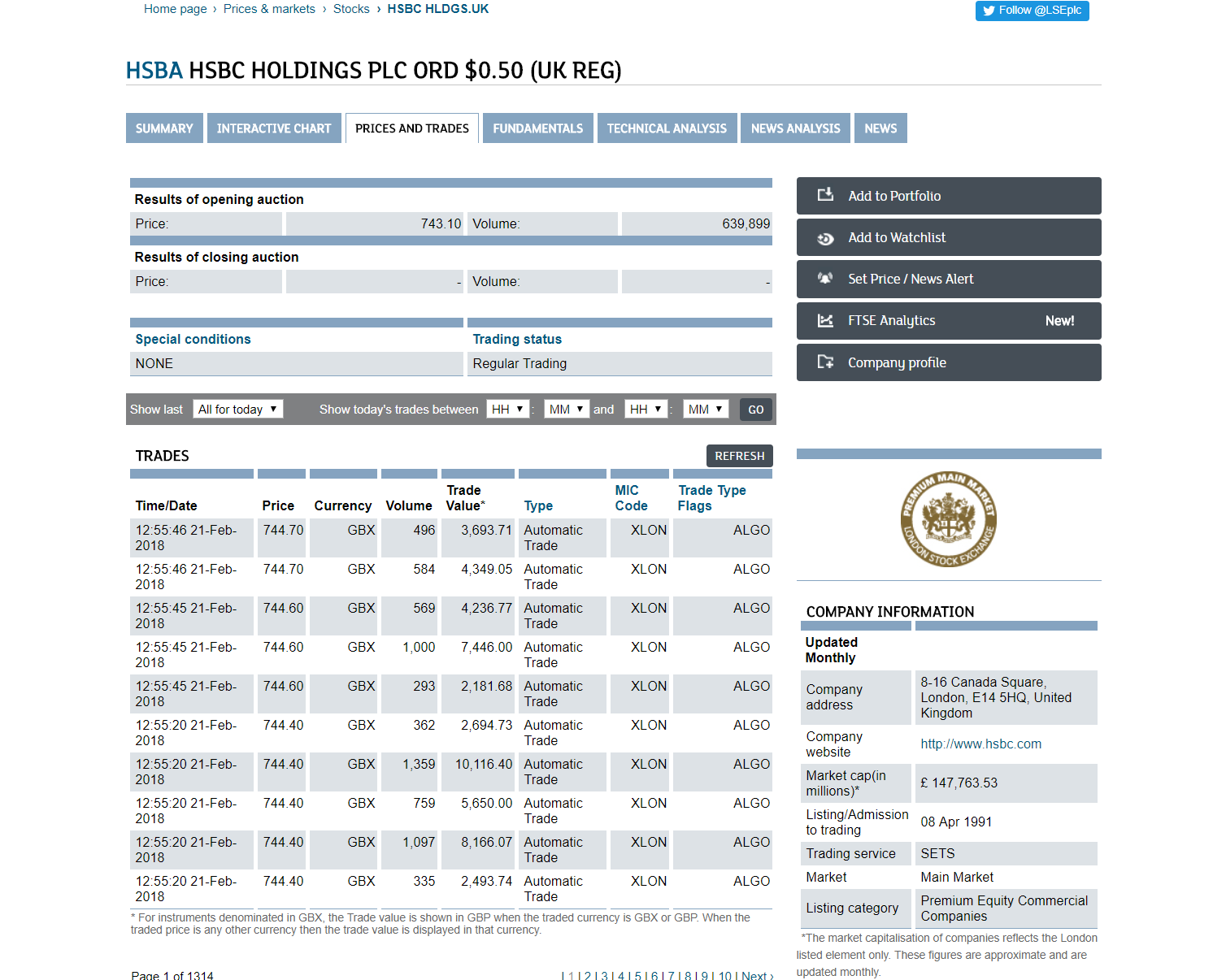 I think your observation and the anecdotal evidence you have provided is definitely on the right track. I worked in the industry and did notice a lot more activity post 2005 from hedge funds in general and specifically Quant strategies and the demand for its personnel. The advent of faster fixed communication lines, processing power and lower latency led to a spurt of HFT funds and strategies and I would regularly observe a bunch of them going round seeking to raise capital (which was quite easy back then). So this ties in with your graphic above. Interestingly the LSE now has a code for indicating which trades are Algo driven which demonstrates how big a part they now play not only in indices and commodities but also underlying equities (see example of HSBC attached, by my rough eyeball calculation 90%+ of all trading in there is Algos but that’s to be expected as it’s a large cap).