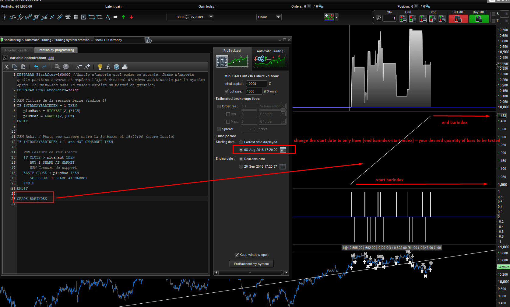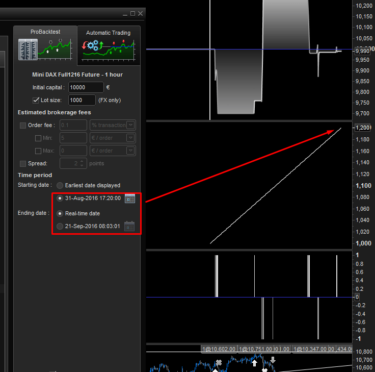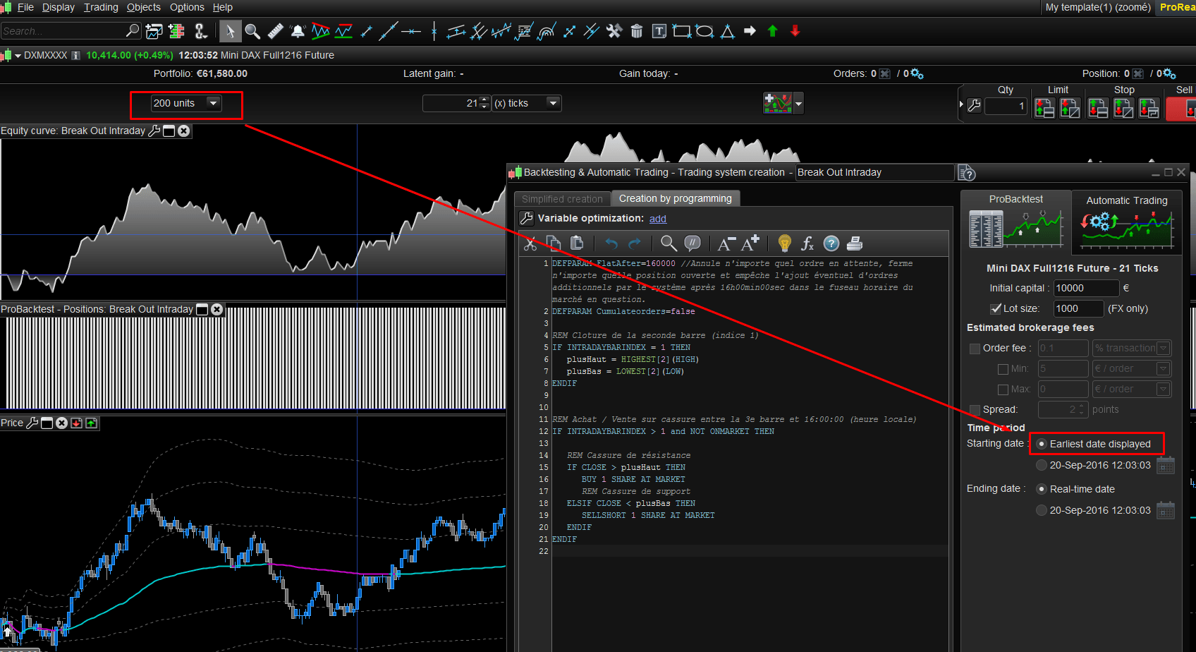 Using the command on top of each graph, one can vary the number of bars observed (200 for instance). However, launcing a backtest from “the earliest date displaied” the baktest is not carried on the 200 bars chosen, but it is always started at the same past date whatever is the number of bars one has chosen to display.