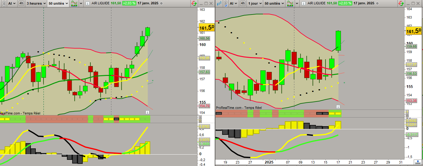 Ici, je recherche à sélectionner les actifs dont la clôture en 3h se ferait au-dessus de la moyenne 20 lors d’un squeeze (sur le graph, le squeeze est actif et visible par les petits rectangles jaunes ou noirs) ET en daily la ligne du macd est croissante et le parabolique SAR est sous les cours