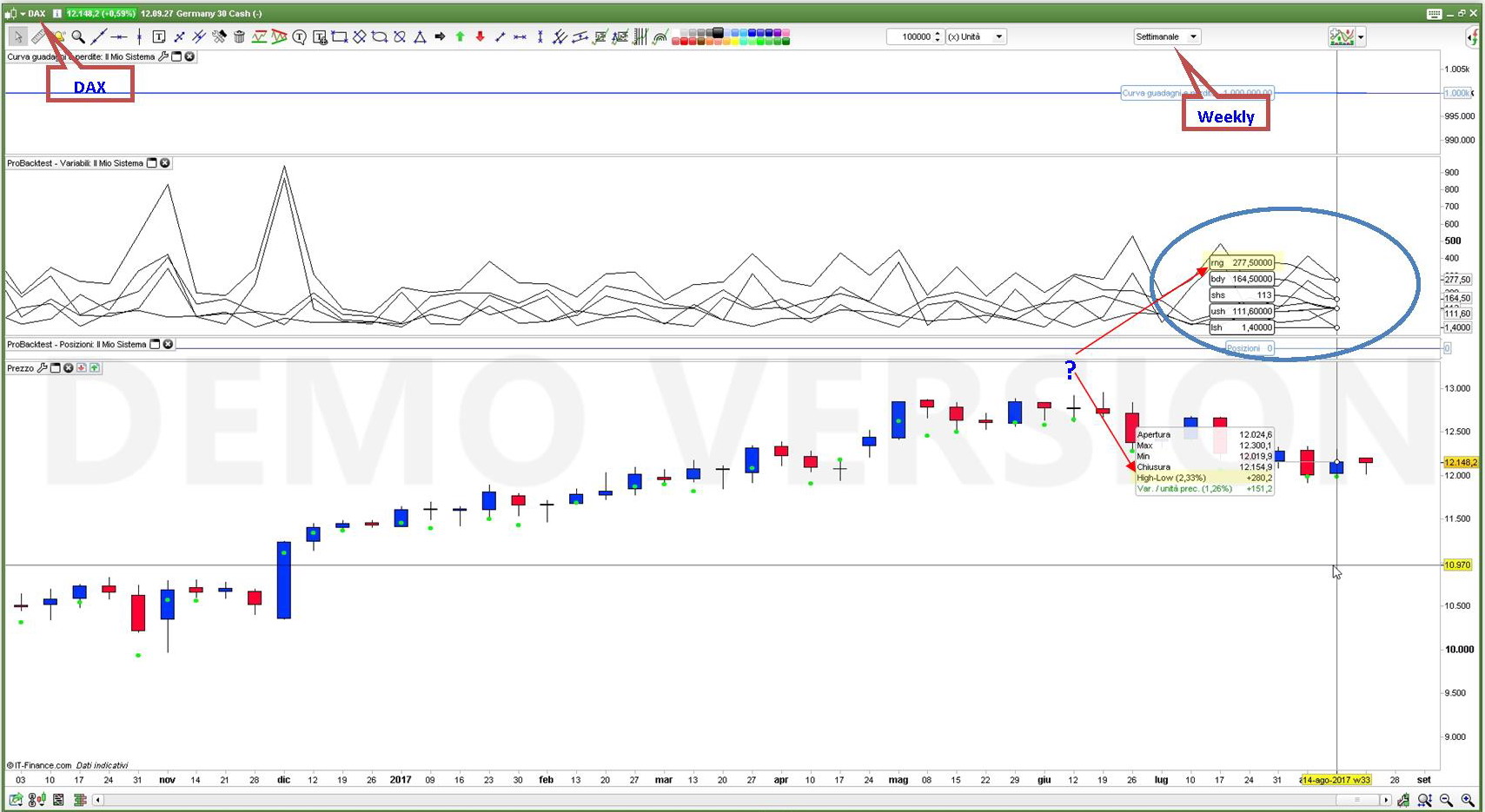 I wrote this strategy (on DAX weekly chart) to debug the values of variables: