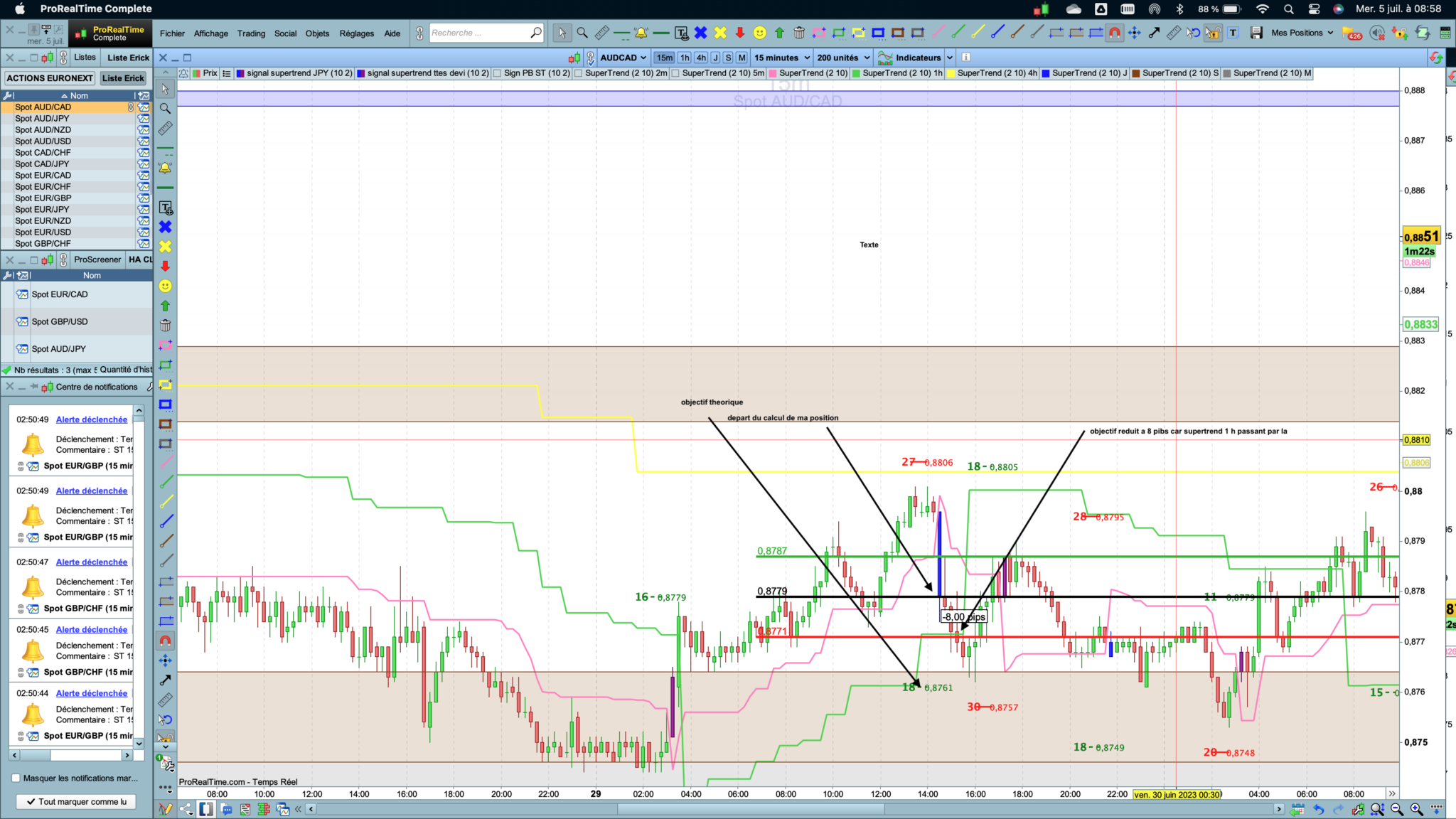 Ma base de depart du calcul, est la cloture chandelier après retournement supertrend 15mn. Tandis que mon stop, est le plus bas/haut mèche de la séquence avec + ou – 5 pibs. Mon report d objectif, est ce meme chandelier mais en cloture.
