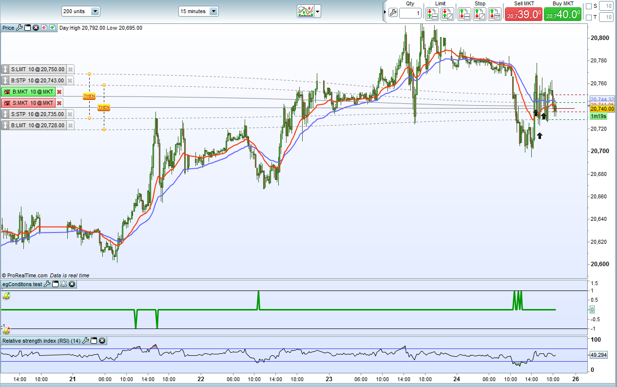 Attached is a screenshot of the alerts running on the Dow 15M futures. You can see beneath the price chart the new indicator “eg Conditions Test”. You can also see the 2 sets of pending orders on the price chart (waiting for the indicator to go to +1 or -1). Each has a target or 10 and a stop of 5 (although there seems to be a small lag in updating the orders when the current price moves).