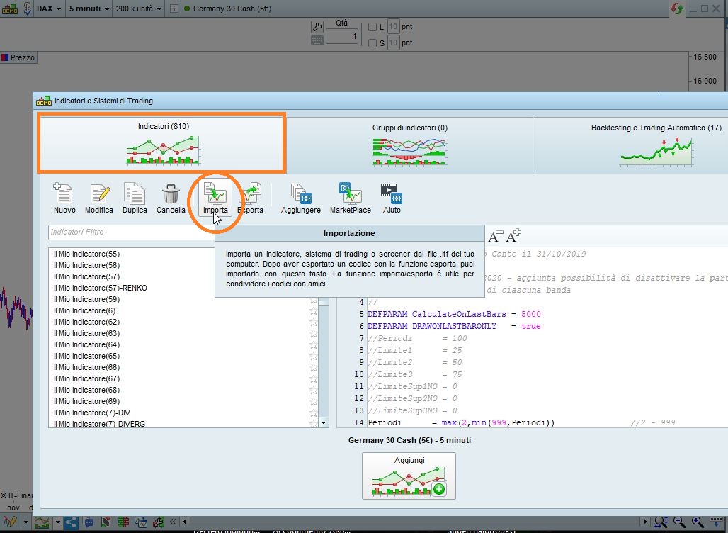 Ad ogni modo per importare un file ITF devi entrare nella sezione degli indicatori (ProBuilder) e da li IMPORTARE il file ITF dalla cartella dove l’hai salvato (vedi le due foto).