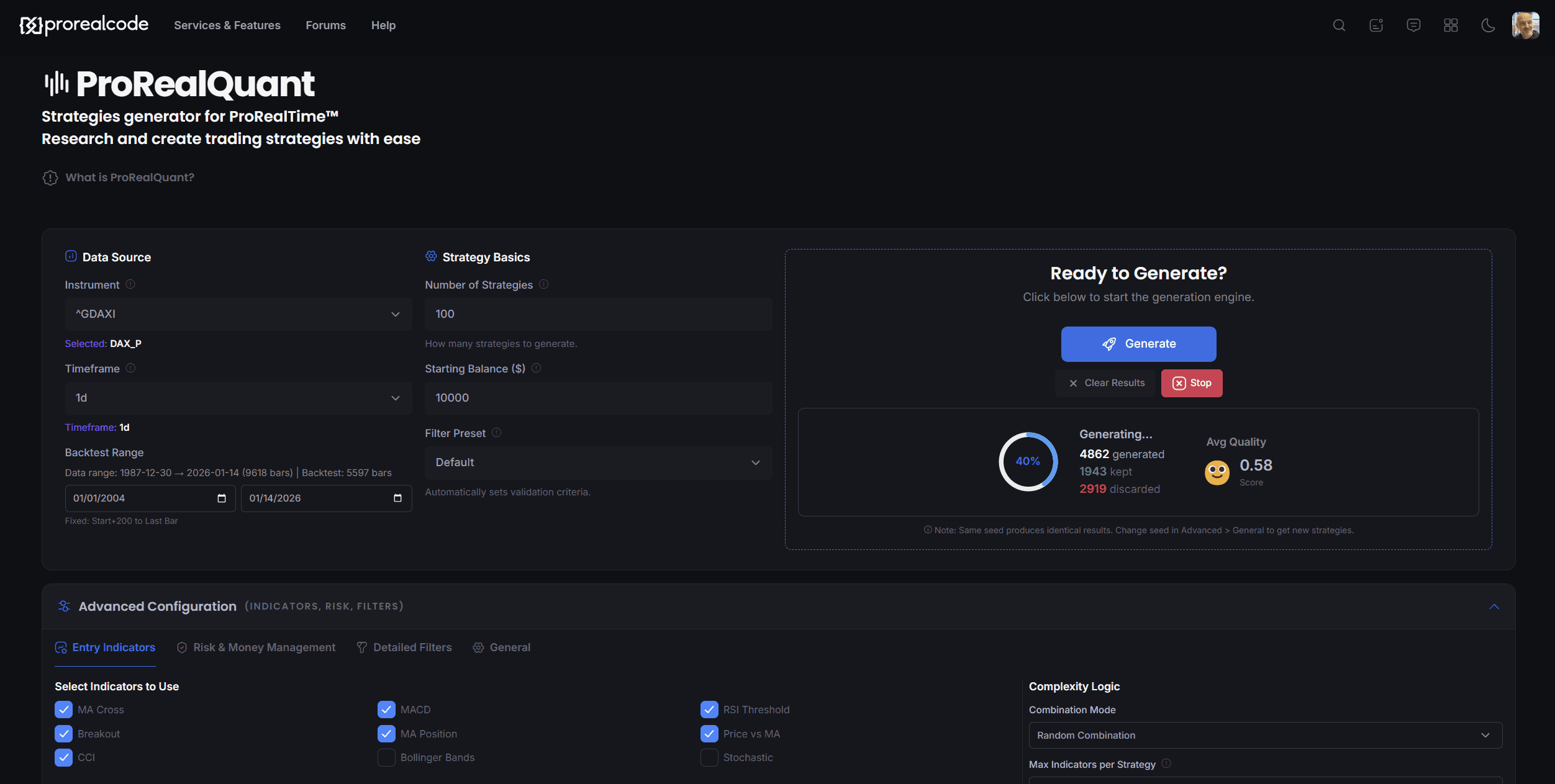 Qu’est-ce que ProRealQuant ? Il s’agit d’un générateur automatisé en ligne qui crée des stratégies de trading à partir d’un ensemble d’indicateurs sélectionnés (moyennes mobiles, RSI, cassures, action des prix…) et les teste en fonction de vos contraintes de risque spécifiques.