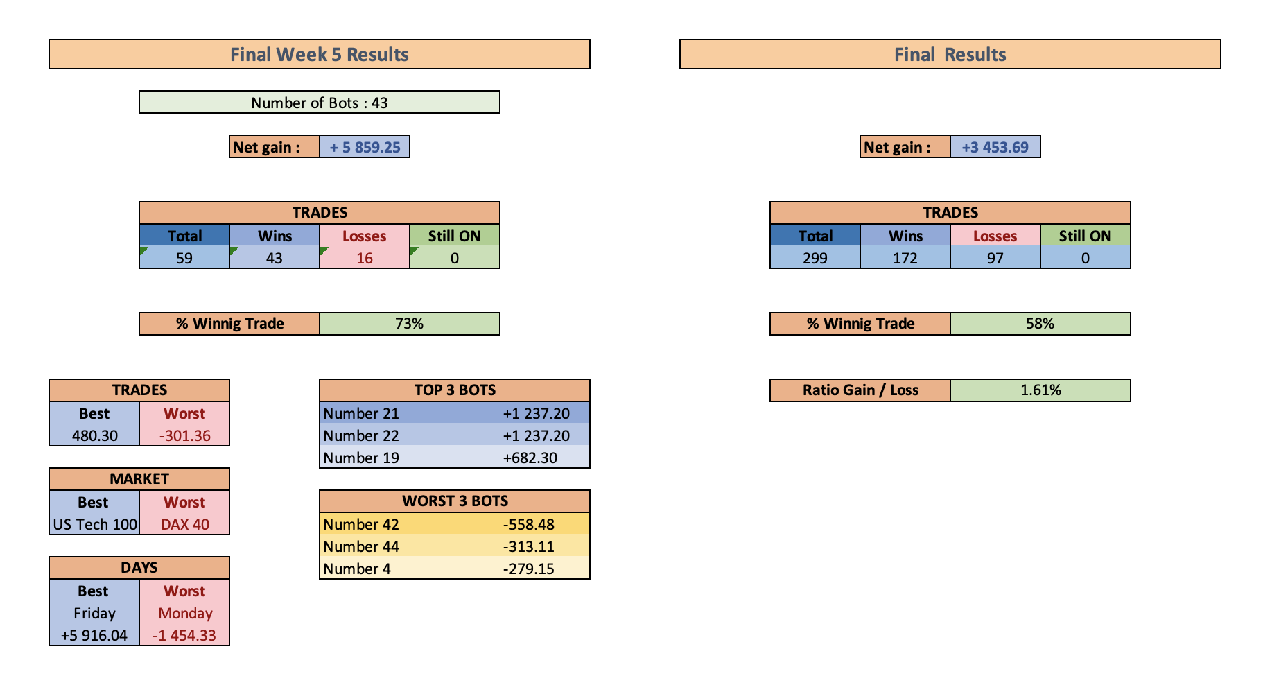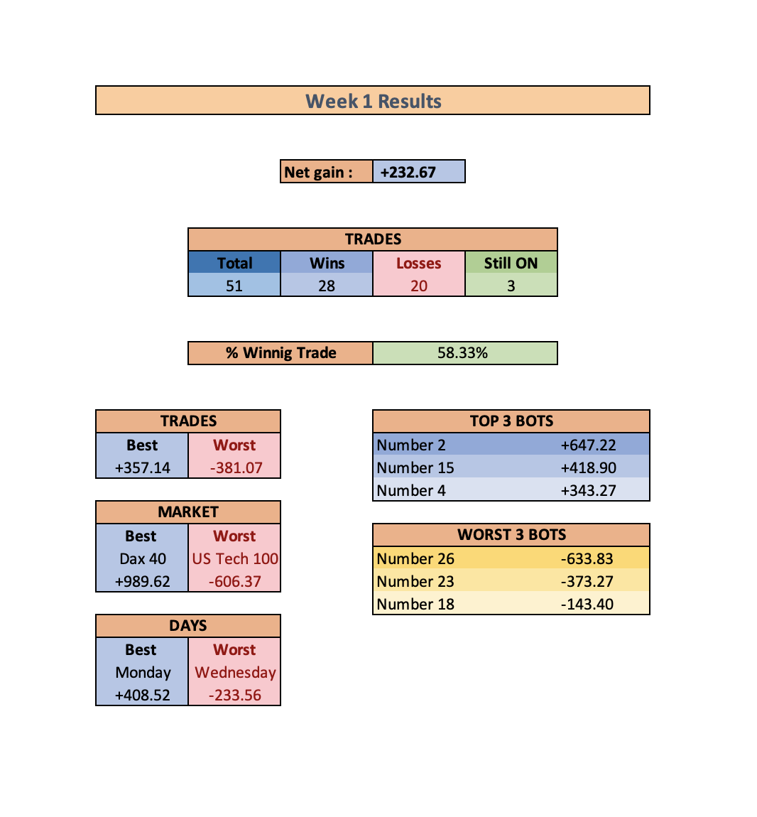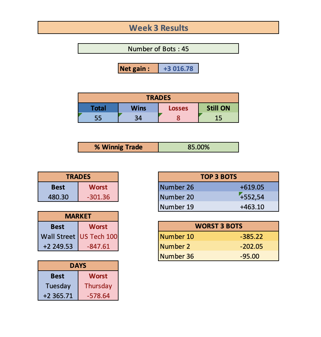 I have already spent hours and days doing the preselection of the bots (and money) and I am happy to share some weekly results here.