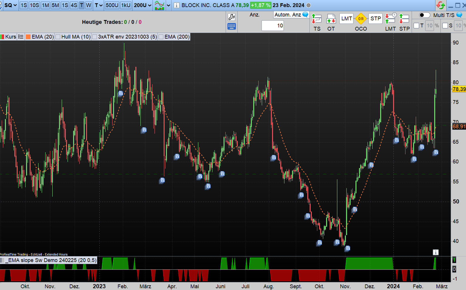 But I prefer to have relative values, to make different stocks kind of comparable. So the additional division with EMA[1]. I multiplied it with 100 to receive the % value, which in more common language often referred as “slope”, so I will need to deal with less decimal places 🙂