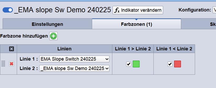 This example is a simple indicator if the EMA slope is steep (positive or negative) or if it is within the noise (to shallow). The 2 variables need to be defined in the variables menu. The colouring of the plot needs to be adjusted in the settings menu for the indicator colour to paint the areas between zero and indicator line either green or red.