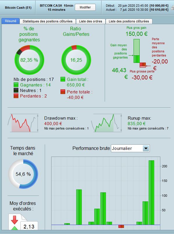 Concernant le Bitcoin Cash, j’ai bien une stratégie qui fonctionne la semaine mais le week-end il y a moins d’activité alors il faudrait adapter celle-ci peut-être avec un ratio gain inférieur.
