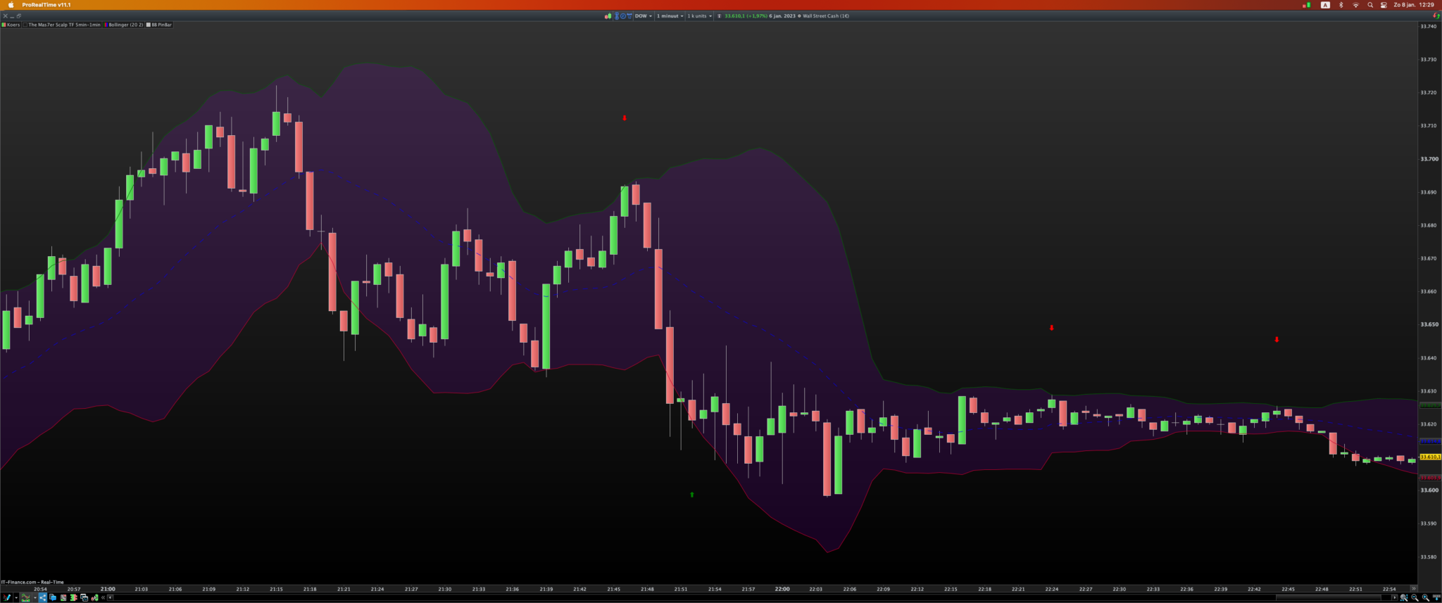 Hello PRT Coders, Happy New Year. I hope you all enjoyed the festive break. Does anyone know if it is possible to code an indicator that draws an arrow above/below a sell/buy condition. The condition would be if price opens inside the bollinger band breaks outside of it and returns to close back in the band forming a pinbar?