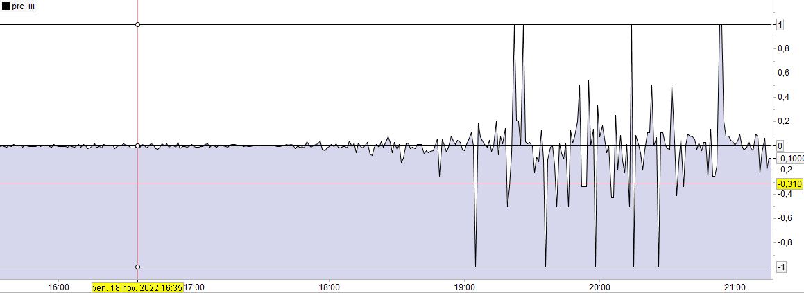 Efface, ou écrase? … car avec “volume” en dénominateur, selon le volume par bougie de l’actif et l’ut considérés, ce iii peut éventuellement se retrouver si petit que sur une petite fenêtre encadrée par -1,+1, il reste trop proche du zéro, cf capture écran pour France40, où les volumes diminuant après la close cash on voit le iii prendre une amplitude qu’il n’avait pas plus tôt lors de plus gros volumes…