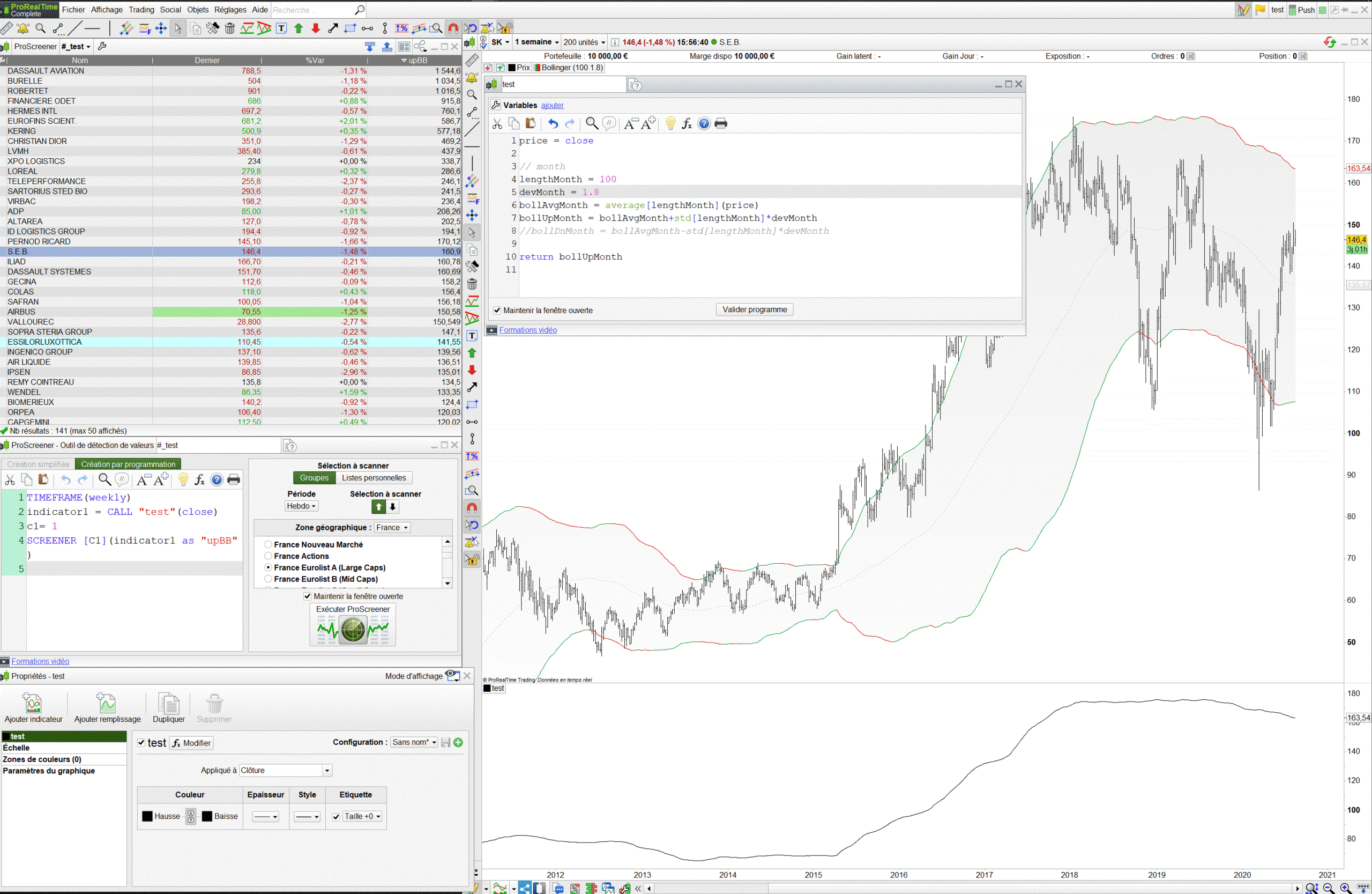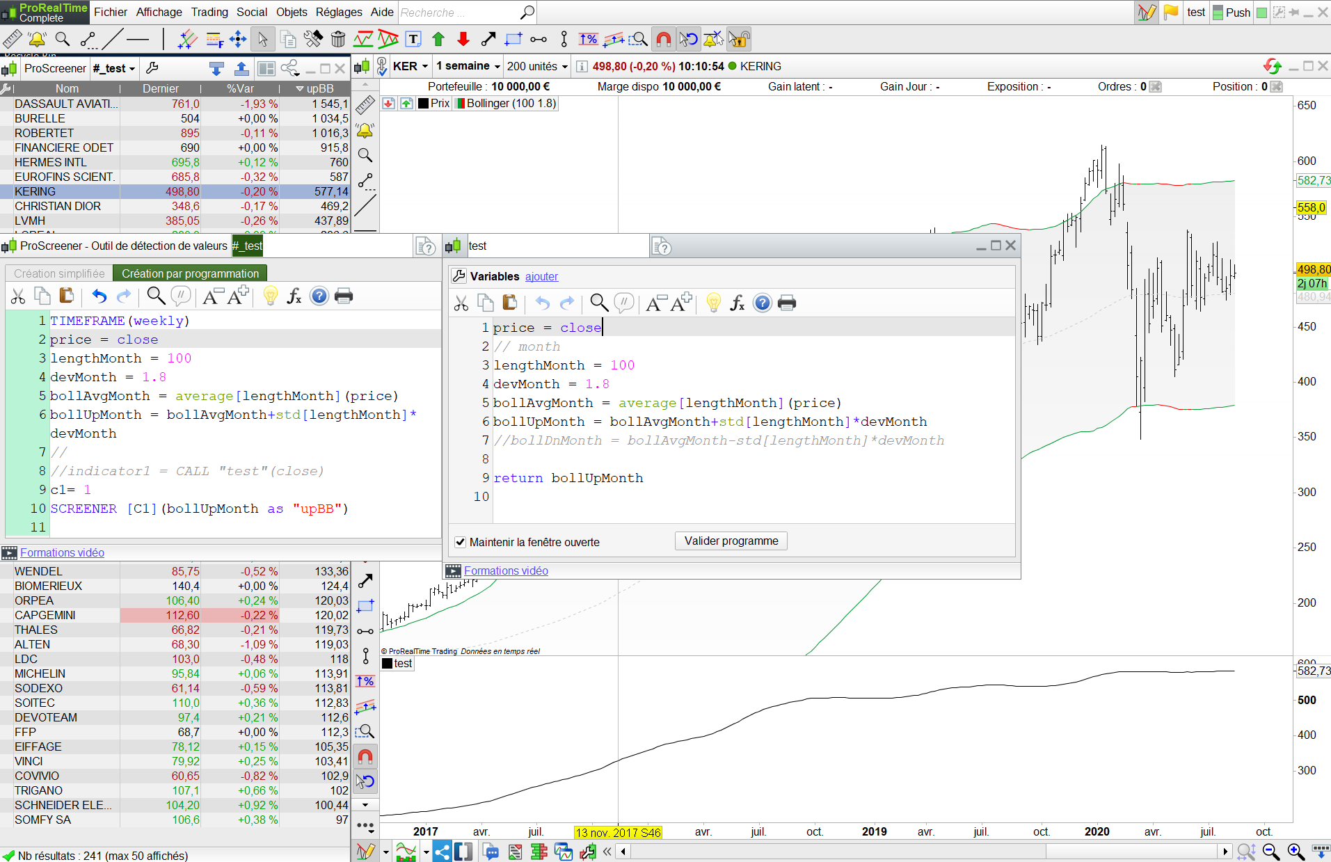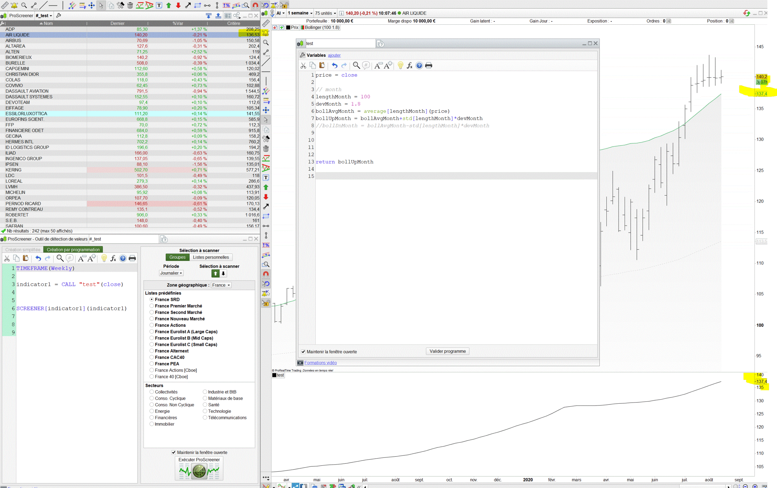 j’ai commencé par creer une condition en timeframe(weekly) avec les bandes de bollinger et je me suis apercu que la bande bollinger sup upperBandW ne retournait pas la meme valeur sur le graphique week et dans le screener