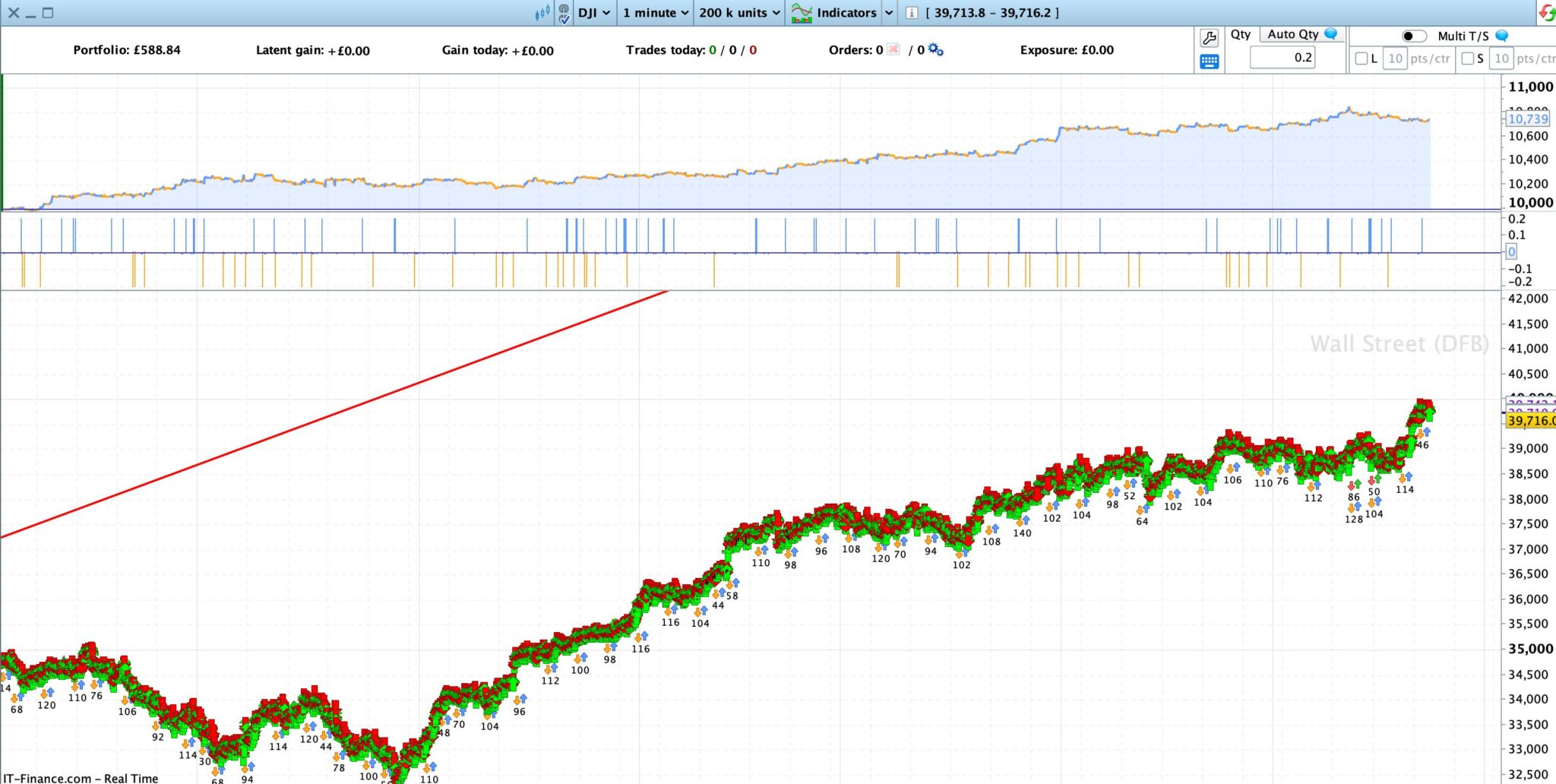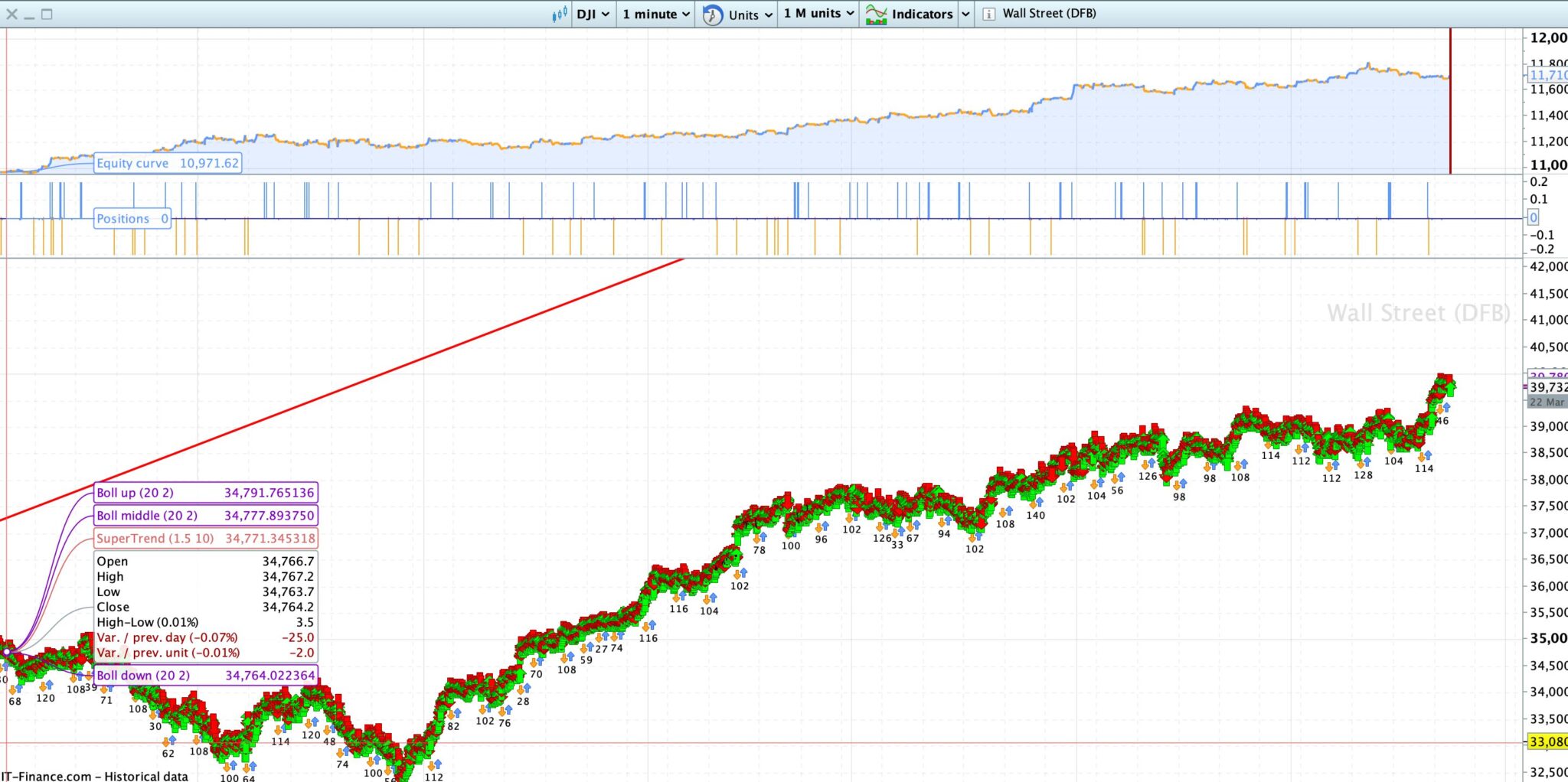 Its a mean reversion strategy where entries are made after bollinger bounce and fractal cross. On DJI 1 min.