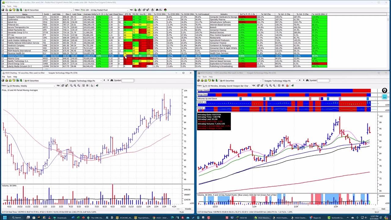 The Bongo indicator was designed by a group of traders at an HGSI seminar. The Bongo turns green when the Wilder’s RSI 8, 14, and 19 are streaming (8 over 14 over 19) and the close price is above the 9 period moving average. The bongo stays green until a down signal is detected (RSI’s streaming 8 below 14 below 19) and the close price is below the 9 period MA at which point it turns red and stays that way until another up signal is detected.