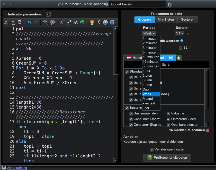 Tu peux également utiliser le screener d’Iván sur une base hebdomadaire : dans la fenêtre du screener, choisis « semaine » au lieu de « jour » (voir image)…