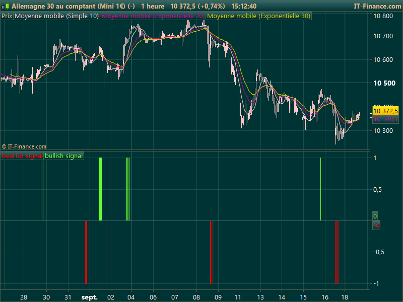 - La media a 10 periodi si trova sotto la media a 20, che a sua volta si trova sotto quella a 30 periodi