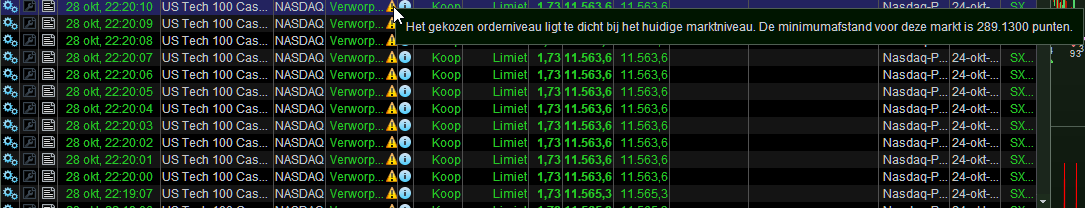 As far as I can tell this is related to the changing spread. Thus, when between USA Stock market’s closing and midnight (22:00 to 00:00 Amsterdam as long as daylight savings is equal to USA (which is not so the upcoming week)) … spread is increased to crazy numbers (e.g. 5 for NasDaq). This can be incorporated in the program, so you don’t need to deal with that distance (which is what it comes down to) throughout. Example :