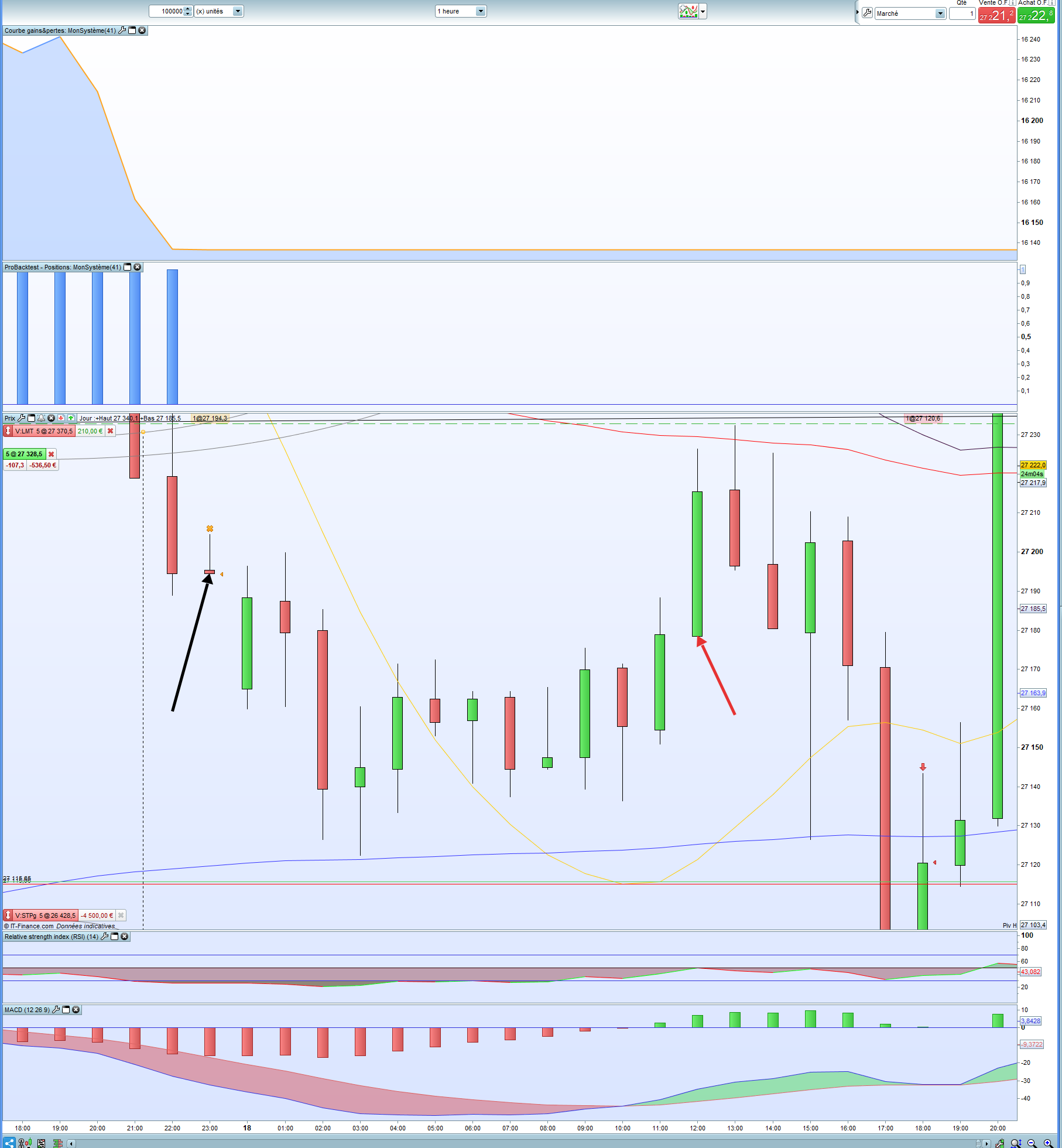 Deuxième point que j’aimerais aborder ; lorsqu’on regarde le détails des ordres passés, je vois que certaines fois où le code devrait me faire prendre position, rien ne se passe. ( J’ai comme condition de prendre position si la valeur de la moyenne est supérieur à la clôture de la valeur précédente, du lundi au vendredi entre minuit et 22h45). On voit bien à la troisième figure qu’un stop a été touché le mercredi 17 juillet à 23h (flèche noir), et que les conditions sont réunies le jeudi 18 juillet à midi (flèche rouge). La valeur de la moyenne de hull est très légèrement supérieure à la clôture de la bougie de 11h (ligne verte) par rapport à la bougie de 10h (ligne rouge). D’ailleurs le dernier ordre date de la fermeture de ma position du 17 juillet à 23h, On voit aussi (quatrième et dernière figure) que le 19 juillet à 1h du matin, le code aurait du me faire acheter une position puisque les conditions sont réunies aussi, alors que mon ordre n’est finalement passé qu’à 3h du matin. De quoi cela peut venir?