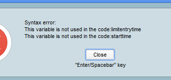 Ah also I just saw the image of the syntax error … looks like you have not used LimitEntryTime and / or StartTime in your code as a condition to Open / Close a trade etc … this is what the syntax error message is telling you.