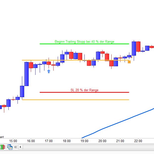 Läuft der Trade auf 40% der Range in den Gewinn, dann wird der Trade getrailt, siehe Bild orange Linie
