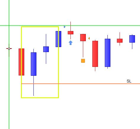 Der Stopp loss kommt auf das Level von 20 % (Range) über das Tief der Range, siehe Bild orange Linie