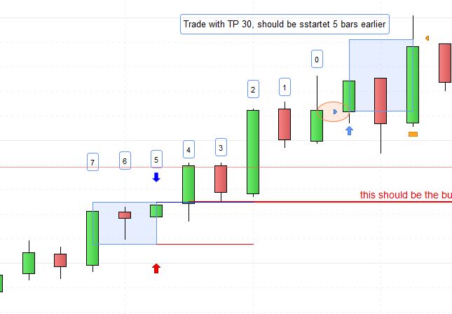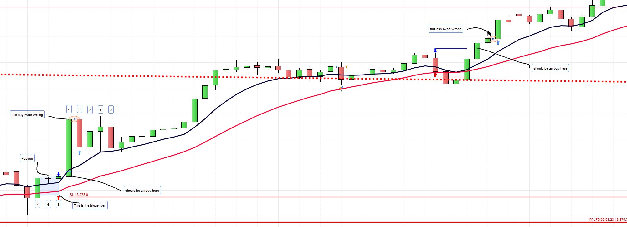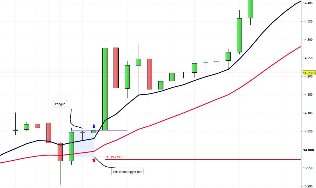 if i have a popgun i wanna go short if one of the next 5 bars is lower than the last bar of the popgun is, the opposite for long. SL under the last bar of the popgung -5 points, long the opposite.